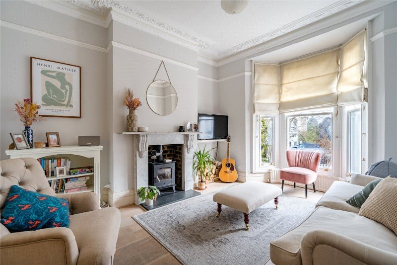 Ideal for families seeking comfort, space, peace and quiet, Winkworth are delighted to present this beautifully co-ordinated, interior-designed living space; the entrance hall opens to a bright front reception room with wooden floors, a charming 'marble' fireplace with a wood burner and large double-glazed sash bay windows to the front. There is also a door which leads onto a second reception room, or it can be used as an additional bedroom and has built in shelving into the alcoves with a bespoke study desk design on one side. Located to the rear of this semi-open plan living area is the family bathroom with a freestanding bath with a shower overhead, a separate shower cubicle, a wash hand basin and a WC.