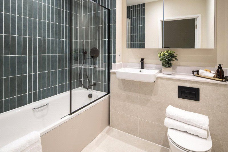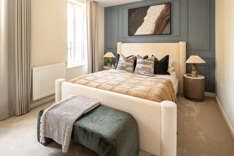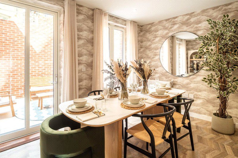 The ground floor is the social heart of the home: a bright open-plan kitchen/dining/living space that’s designed for everyday living and entertaining, with doors opening straight out to a private turfed garden. The kitchen finish feels smart and contemporary, with hunter-green cabinetry, brass detailing, stone-style worktops and integrated Bosch appliances, complemented by under-unit lighting and clean modern lines.