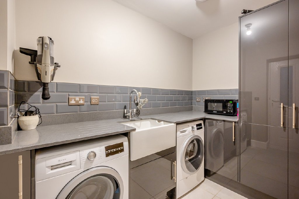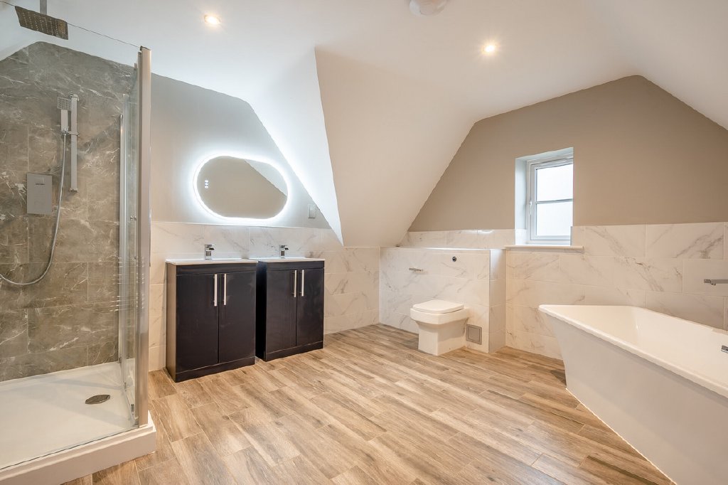 On the first floor is a wide central landing with access to four bedrooms and the family bathroom. There are two double bedrooms at the front of the house and a third overlooking the rear garden. The main bedroom is a lovely bright and spacious room with a luxurious en-suite shower room. The main family bathroom is again another luxurious room with a free standing bath and large shower cubicle and twin basins, it is beautifully tiled in contrasting putty and dark grey tiles. On the second floor is another suite of rooms that could be the main bedroom or a guest suite, it has an eaves style double bedroom with a dressing room and a separate bathroom which is an exceptional size and features a free standing bath, large shower cubicle, twin basins and striking marble effect tiles.
