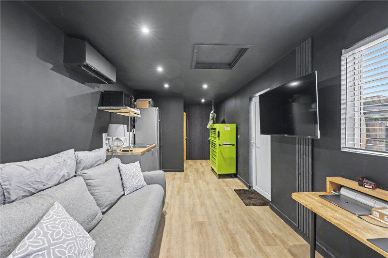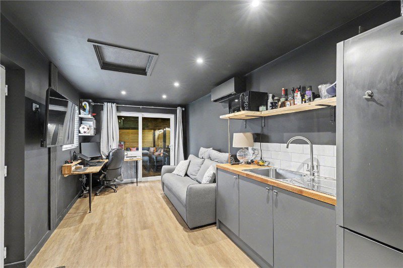 Externally this superb property boasts off-road parking to a generous drive and gated access to the side of the home. This will lead you to the rear garden where the current owners have landscaped the space with a mix of lawn and stylish patio creating the perfect setting for outdoor dining and entertaining. The garage has been converted into a fantastic home studio featuring a 21ft family room complete with kitchen units, air-conditioning and a modern shower room. Through sliding doors in the studio you enter the decked and sheltered outdoor seating area with access to the home sauna. This areas creates a truly tranquil setting for a social gathering or relaxing day, through rain or shine.