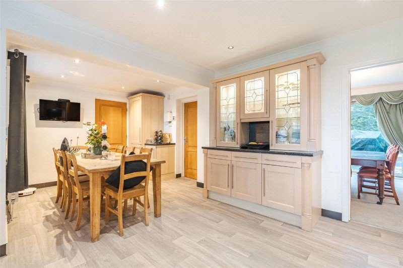 At the rear of the house there is a spacious, dual aspect sitting room with patio door to the garden, and archway to a dining room with a further patio door to outside. At the front, the kitchen/breakfast room has an excellent range of modern units and worktops, gas range cooker (with 5 burners), extractor, integrated dishwasher, dresser unit, cupboard housing the gas central heating boiler, and door to the garage complex.