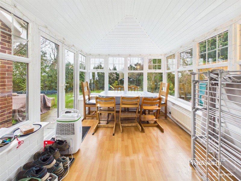 The accommodation comprises an entrance hall, a downstairs WC, a spacious L-shaped living room, a fitted kitchen, and a bright conservatory/dining room overlooking the private garden. To the first floor, there are three generous bedrooms and a family bathroom suite.