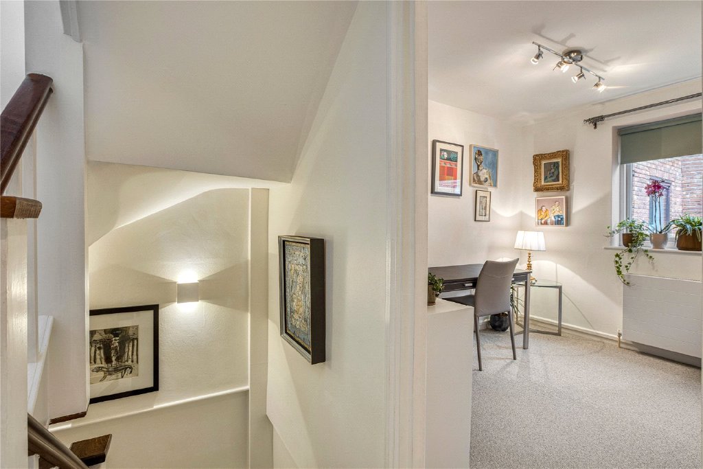 The top floor presents a versatile third bedroom or study, opening directly onto a private roof terrace finished with specialist terrace tiles. This level also benefits from an additional bathroom, complete with a toilet and an integrated waste system. The shower has been removed, as the space is currently configured for utility use; however, all plumbing remains in place, allowing the shower to be reinstated with ease should the layout be reconfigured to create a complete shower room. The existing ground-floor storage cupboard also provides flexibility to position alternative utilities if preferred. There is also scope to extend the top floor, as neighbouring properties within the mews have done, subject to the usual planning consents, providing future potential to enlarge this part of the house if desired.