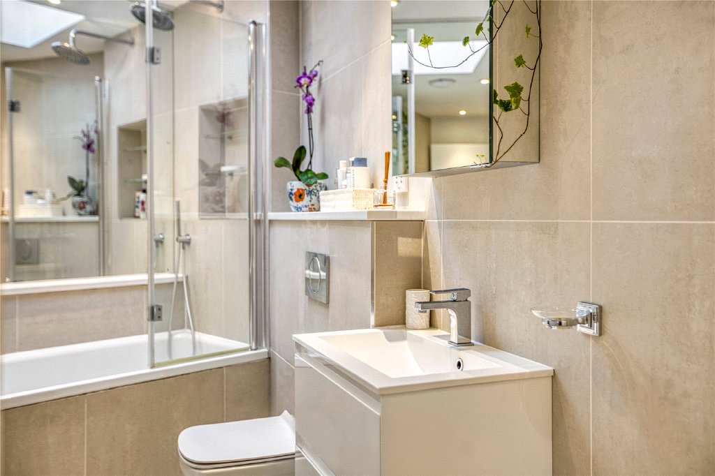 Ascending to the first floor, two well-proportioned bedrooms offer fitted storage and balanced dimensions. The family bathroom has been extended and fully refitted with new sanitaryware, tiling, lighting and heating. A generous rooflight above the bath draws natural light into the space, enhancing brightness and creating a calm, carefully executed environment designed for daily ease.