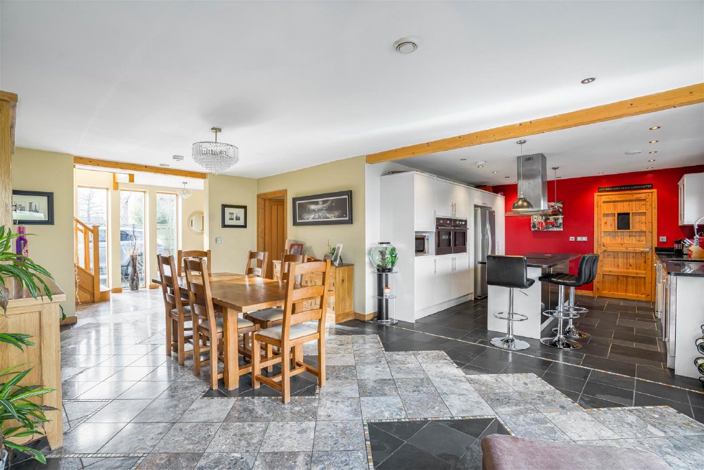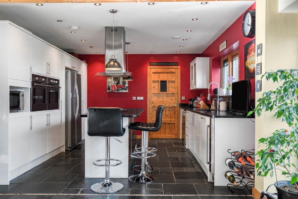 The well-appointed kitchen is equipped with an array of wall & base units, granite work surfaces and integrated appliances. A centre isle provides additional cupboard & countertop space., while also doubling as a breakfast bar.