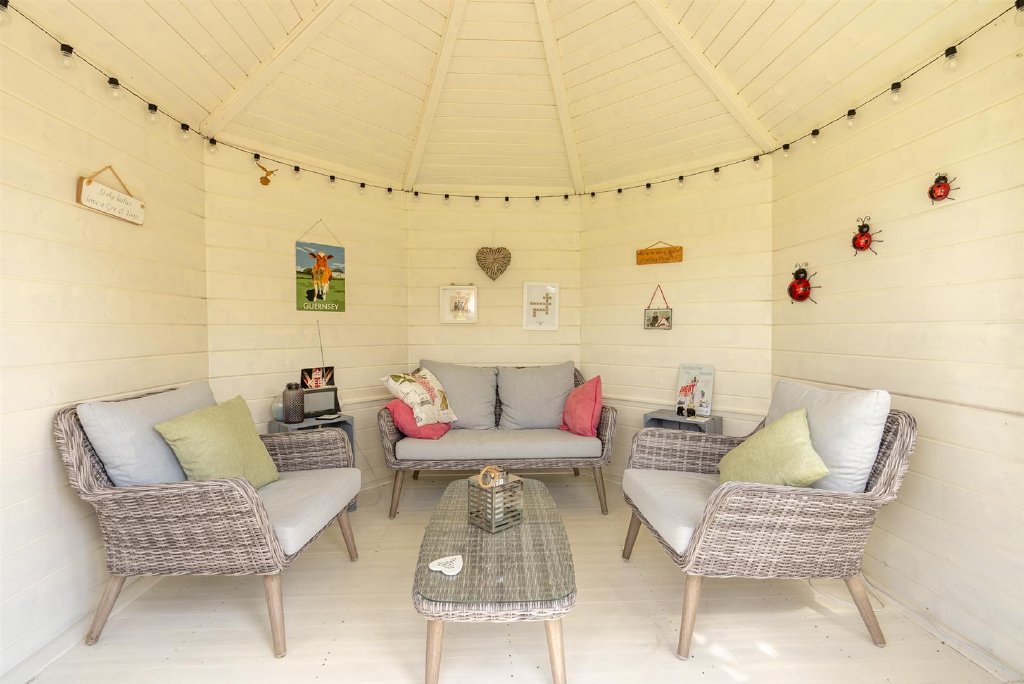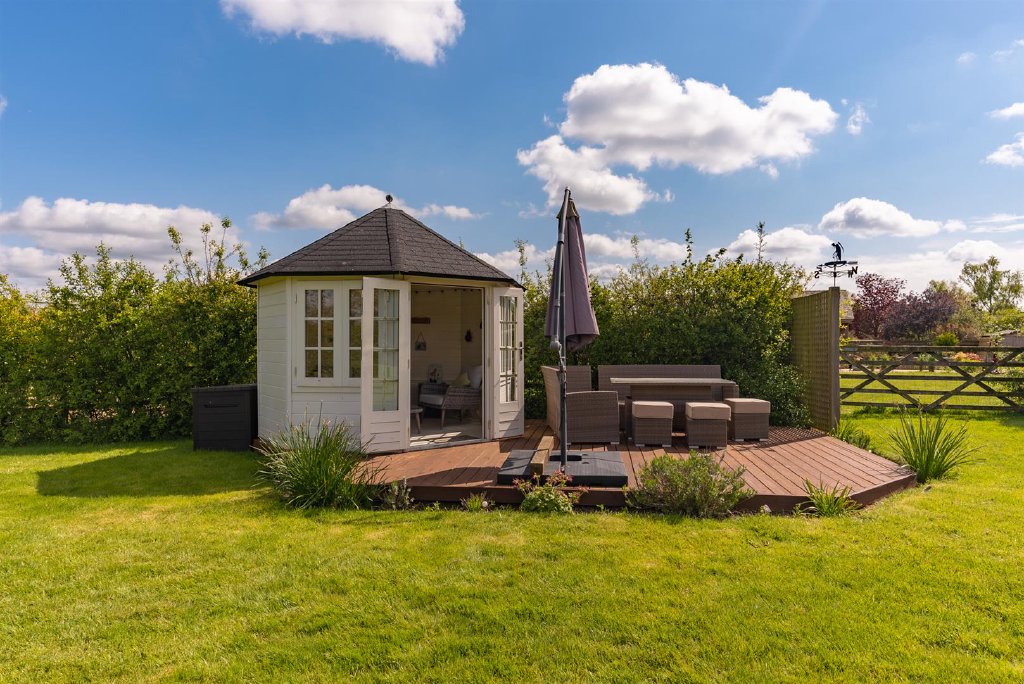The fabulous rear garden boasts a delightful patio area and a lawn with flower beds. A summerhouse sits at the end of the garden with a decked seating area.