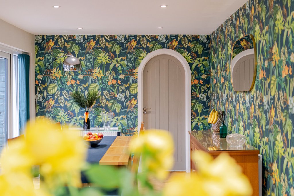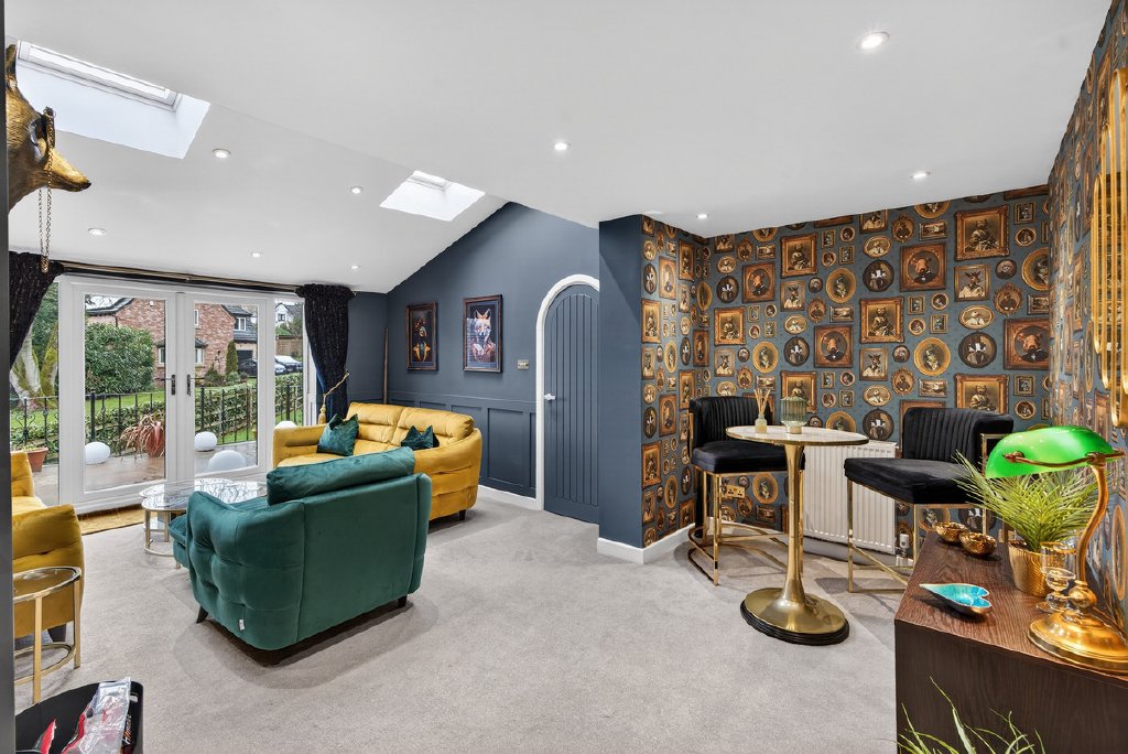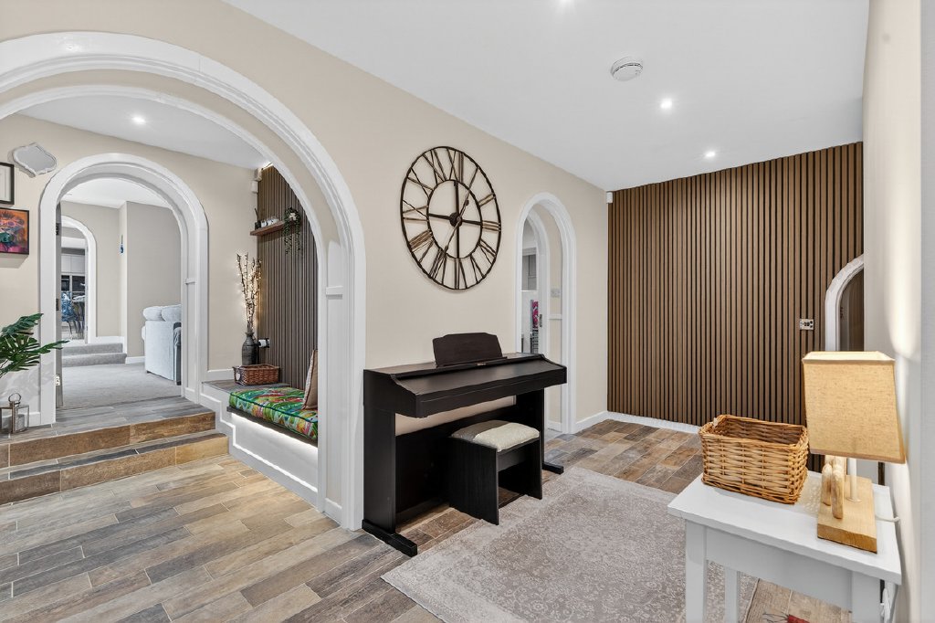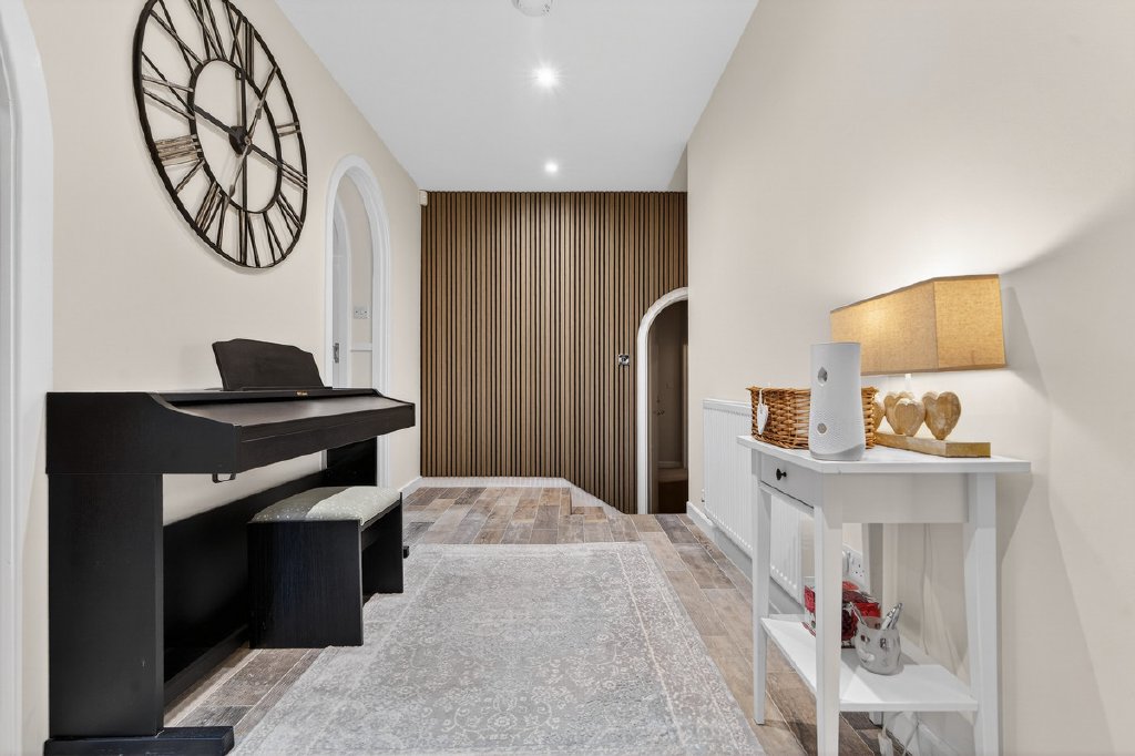 Ground Floor: The main entrance opens into an impressive reception hallway, featuring wood-effect tiled flooring and bespoke acoustic panelling, providing an immediate sense of the home’s exceptional quality.