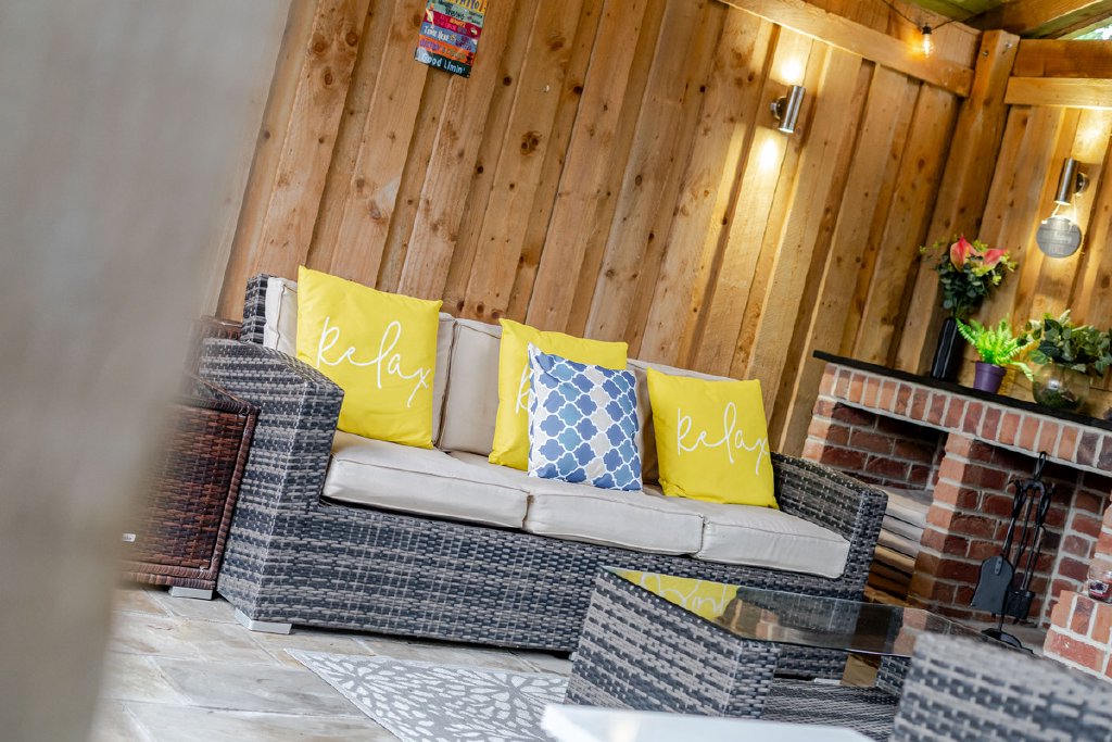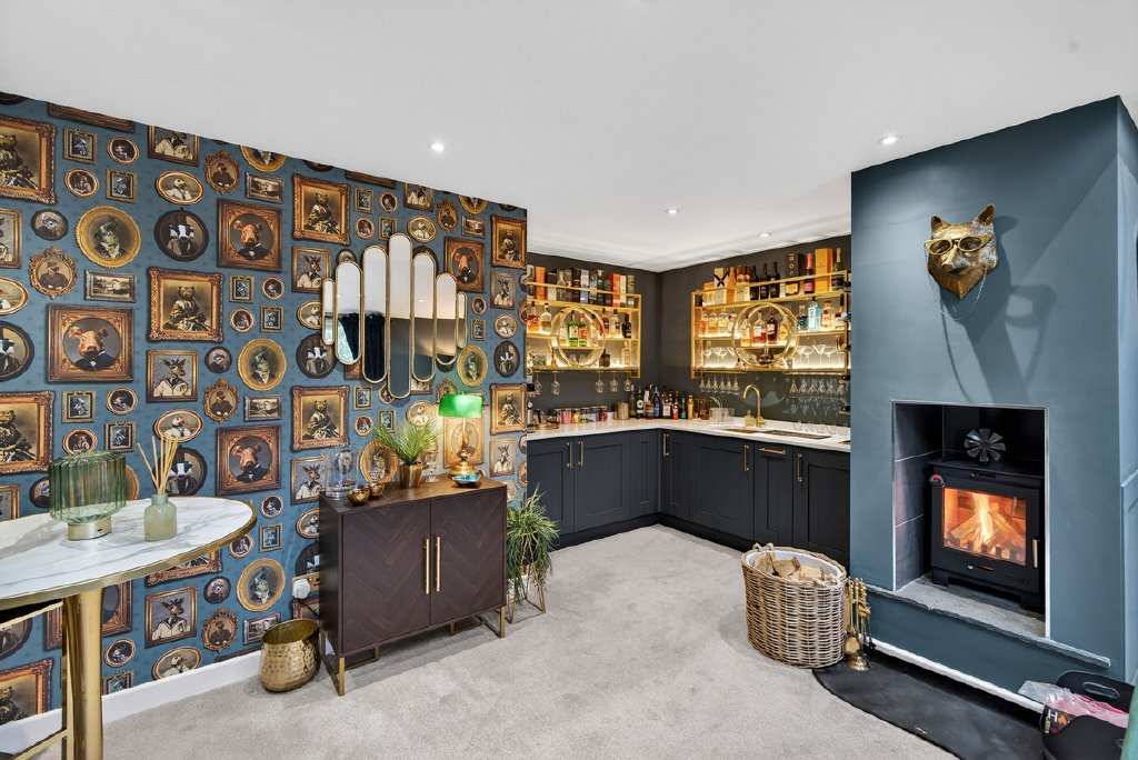 To the right of the entrance hallway, there is a versatile office or craft room, a stylish WC with built-in storage, and two additional bedrooms. This wing also features an impressive bar room, creating an exceptional space for entertaining guests or enjoying a quiet evening by the log burner in sophisticated comfort, with the added benefit of French doors opening out onto an additional patio area looking out over the established front garden, creating more entertainment space.