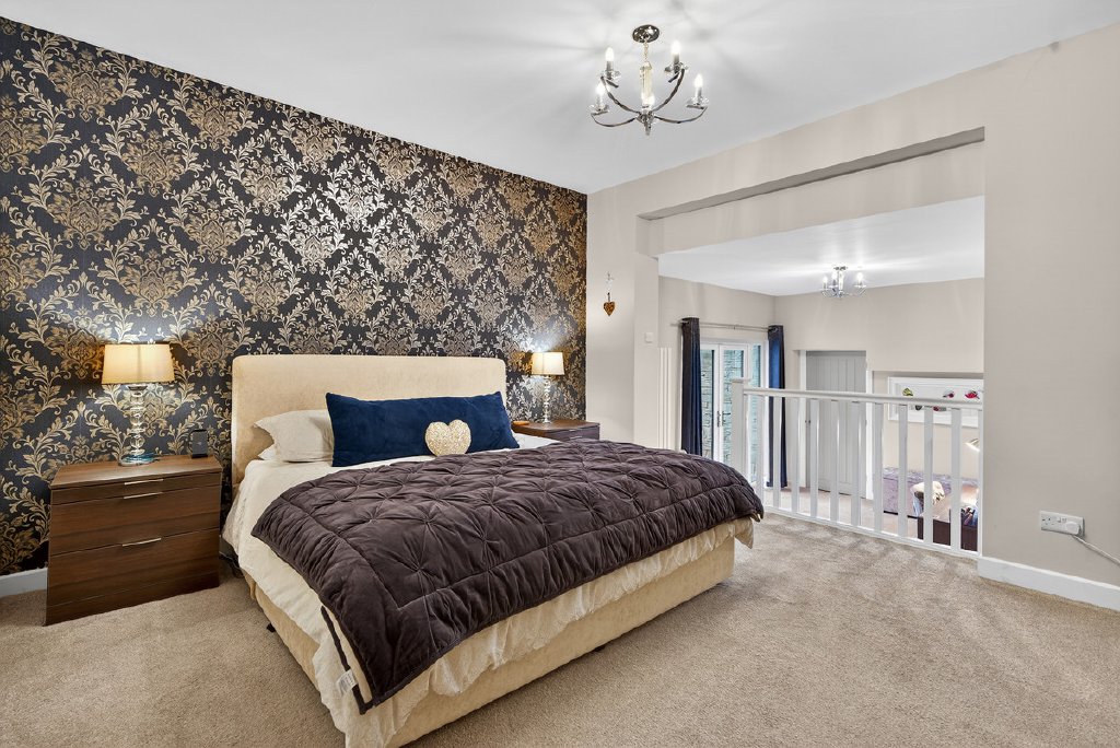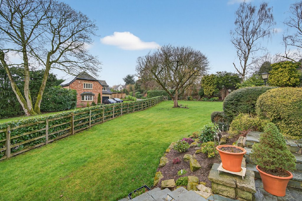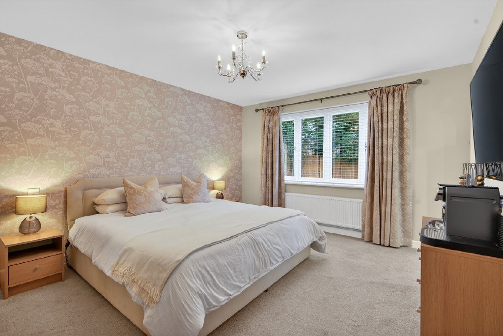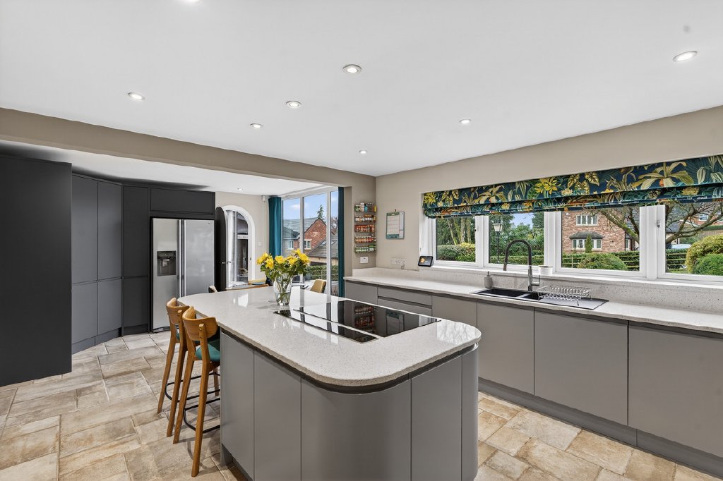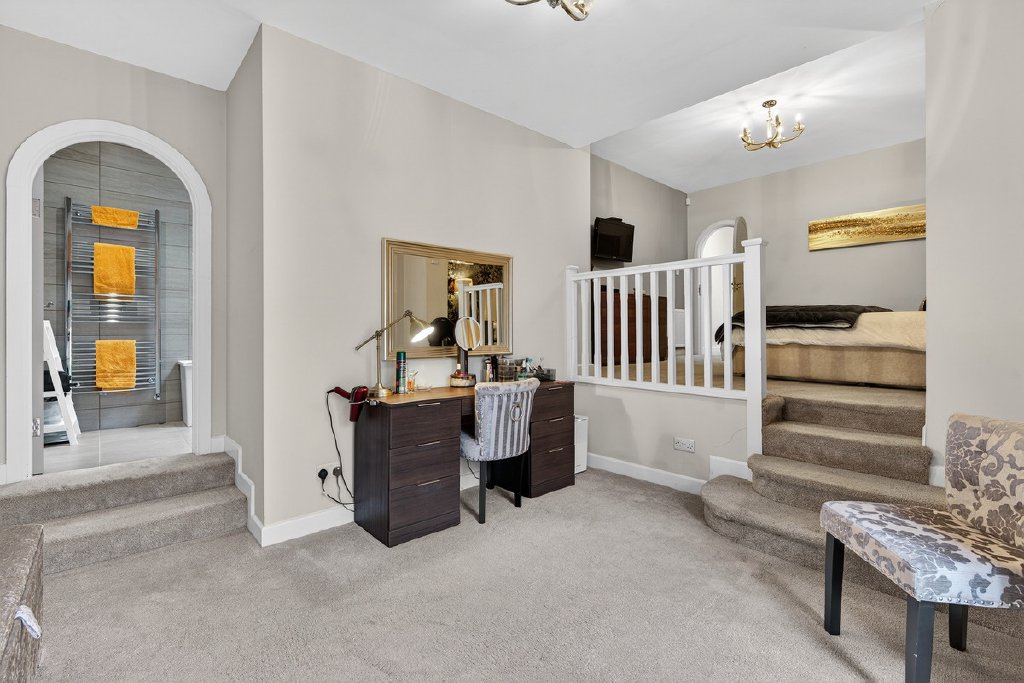 Also off the kitchen, a private corridor leads to the principal suite, which boasts a sumptuous dressing area with French doors leading out to a patio looking out over the extensive private gardens to the rear. The principal suite also benefits from a spacious walk-in wardrobe, and a luxurious en-suite bathroom. Beyond, there are three further double bedrooms, one with its own en-suite, while the remaining two are served by a beautifully appointed family bathroom, offering comfort and elegance for family living.