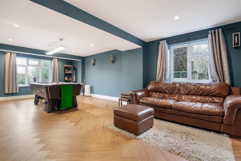 The elegant sitting room is bathed in natural light with large windows and doors leading to the garden, and a dual aspect log burner offering a calm retreat, while the impressive games room to the front of the property provides excellent space for recreation or could easily be adapted to a media room or children's playroom.