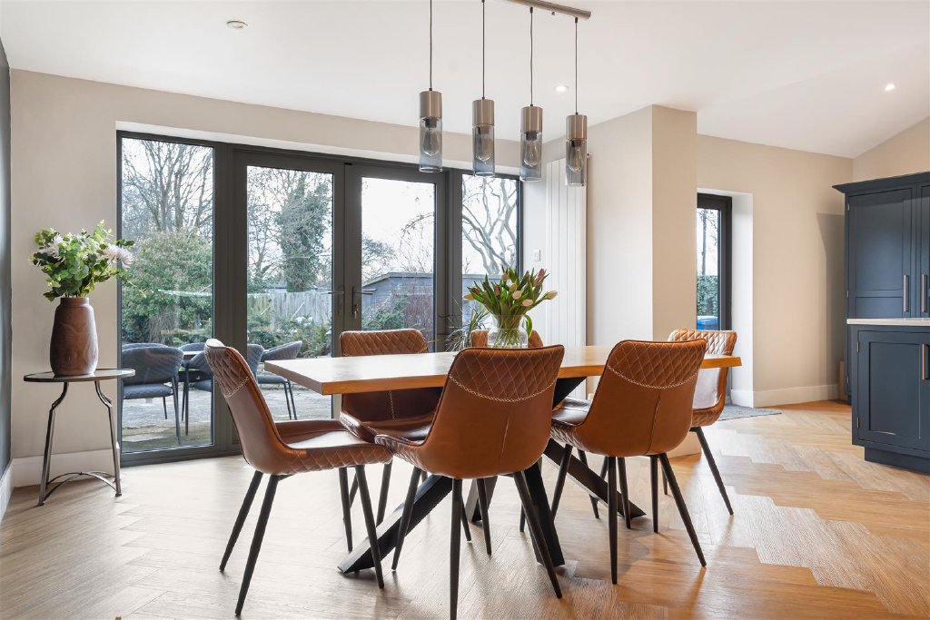 A central island with an integrated wine fridge creates a natural gathering point, while the generous dining and seating areas enjoy views over the garden and direct access outside - perfect for seamless indoor-outdoor living during the warmer months.