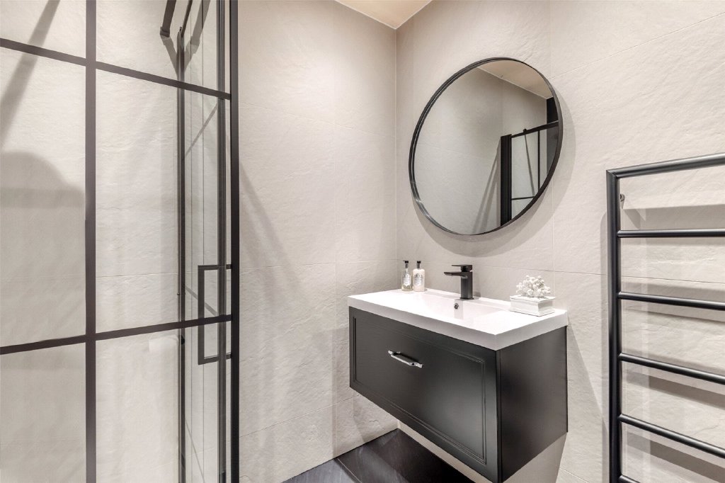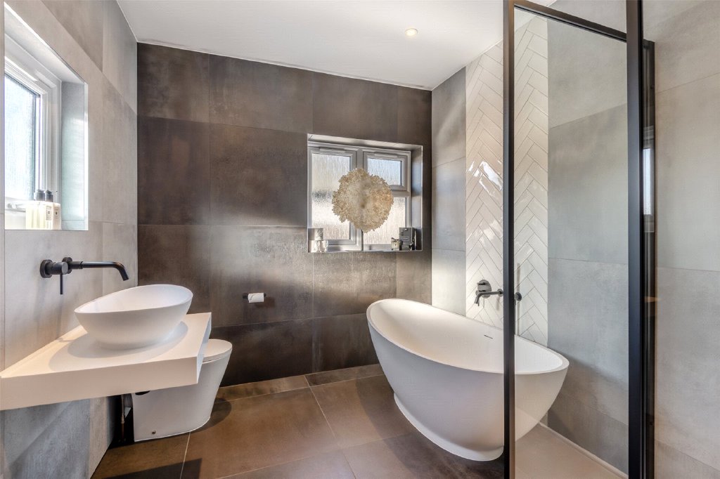 Upstairs, the main bedroom suite is particularly impressive, enjoying views to the rear. A cleverly screened dressing area provides excellent built-in storage, with the addition of a well-appointed en suite shower room. Bedroom two also benefits from its own en suite shower room and built-in wardrobe, while bedrooms three and four are served by a beautifully fitted family bathroom featuring a freestanding bath and separate shower. In total the house offers four bedrooms, a family bathroom and two en suites, arranged to provide flexibility for families or those working from home.