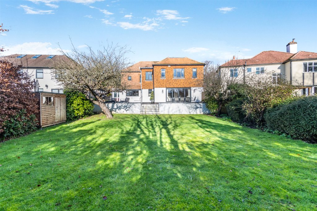 Externally, the south facing rear garden has been designed as a true sun trap, with a raised porcelain tiled patio zoned for cooking, dining and relaxing around the firepit, stepping down to a lawn bordered by established trees and shrubs along with a garden shed. An additional integral store to the front (formerly part of the original garage) provides useful additional storage.