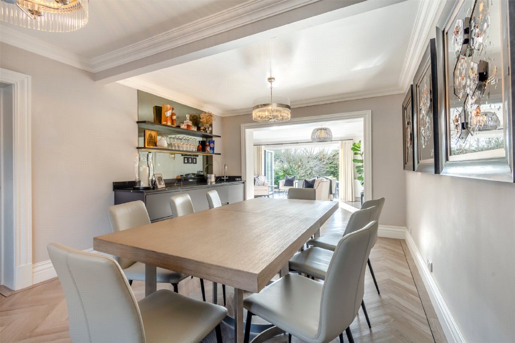 The sitting room is a superb principal reception space, wonderfully spacious and centred around a feature open fireplace that creates a natural focal point. Double glazed bi-fold doors open directly onto the south facing garden, creating a seamless flow between indoor and outdoor living and allowing natural light to flood the room throughout the day, making it an ideal setting for both relaxed family evenings and entertaining guests. To the front, the dining room enjoys an open plan aspect to the sitting room and has been enhanced with a bespoke bar area complete with sink, fridge and Quartz surfaces, making it ideal for entertaining.