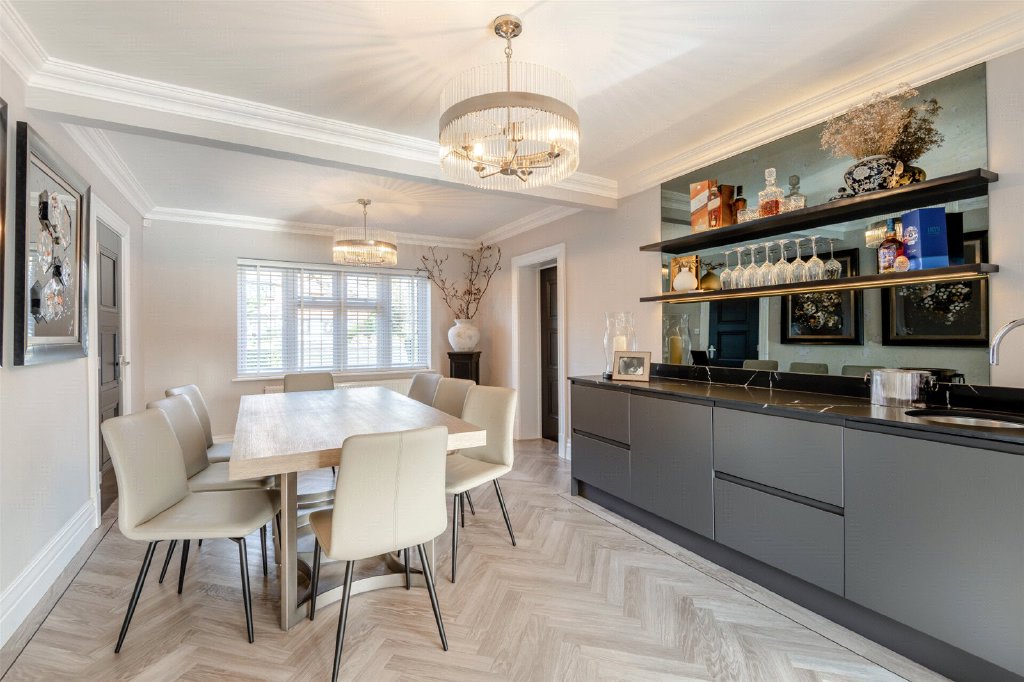 Dining Room 17'6" x 11'7" (5.33m x 3.53m). Double glazed leaded light effect window to front. Karndean wood effect flooring. Plain coved ceiling. Radiator. Bar with sink and fridge with Quartz surfaces.