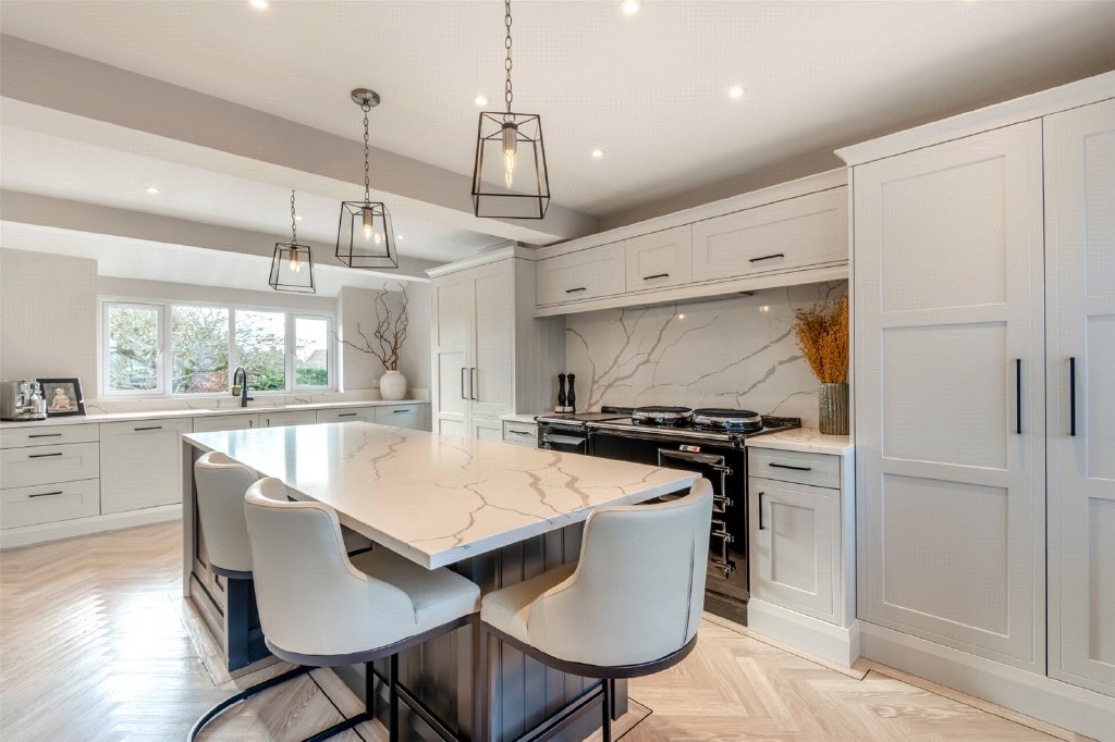 Kitchen/Breakfast Room 21'5" x 11'5" (6.53m x 3.48m). Double glazed window to rear. Double glazed leaded light effect window to front. Karndean wood effect flooring. Plain ceiling with downlights. Fitted wall and base units with island and Quartz surfaces over. Inset sink with hot tap and mixer taps. Neff fan oven. Aga 4 oven range with extractor fan over. Integrated fridge/freezer. Two Bosch dishwashers.