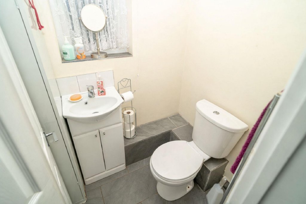 A wooden staircase leads to the first floor, opening onto a generous landing with fitted storage cupboards. Three comfortable bedrooms are arranged on this level. The principal bedroom features fitted wooden wardrobes and a private en-suite bathroom. Bedroom two is particularly spacious and filled with natural light, while bedroom three benefits from built-in wardrobes. A large family bathroom completes the accommodation.