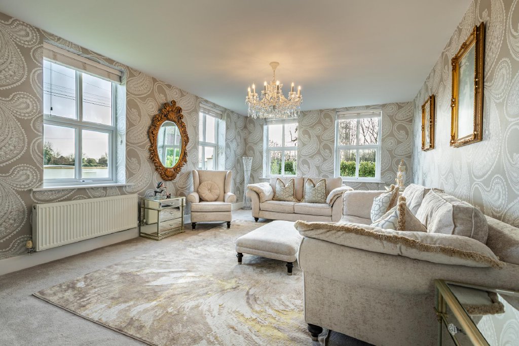 A picture-perfect rendered detached residence, set within beautifully maintained wraparound gardens and complemented by a separate double garage with generous parking for several vehicles. Offered to the market at £750,000, this modernised four-bedroom former farmhouse seamlessly blends timeless character with contemporary comfort, creating a home of both style and substance.