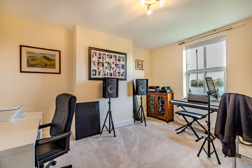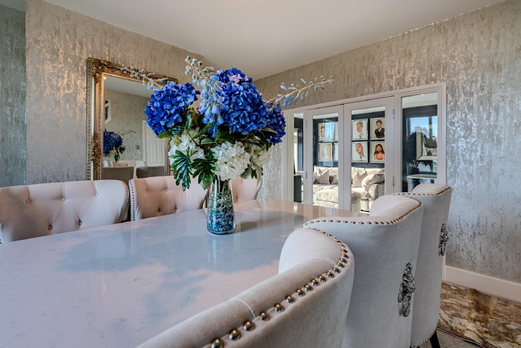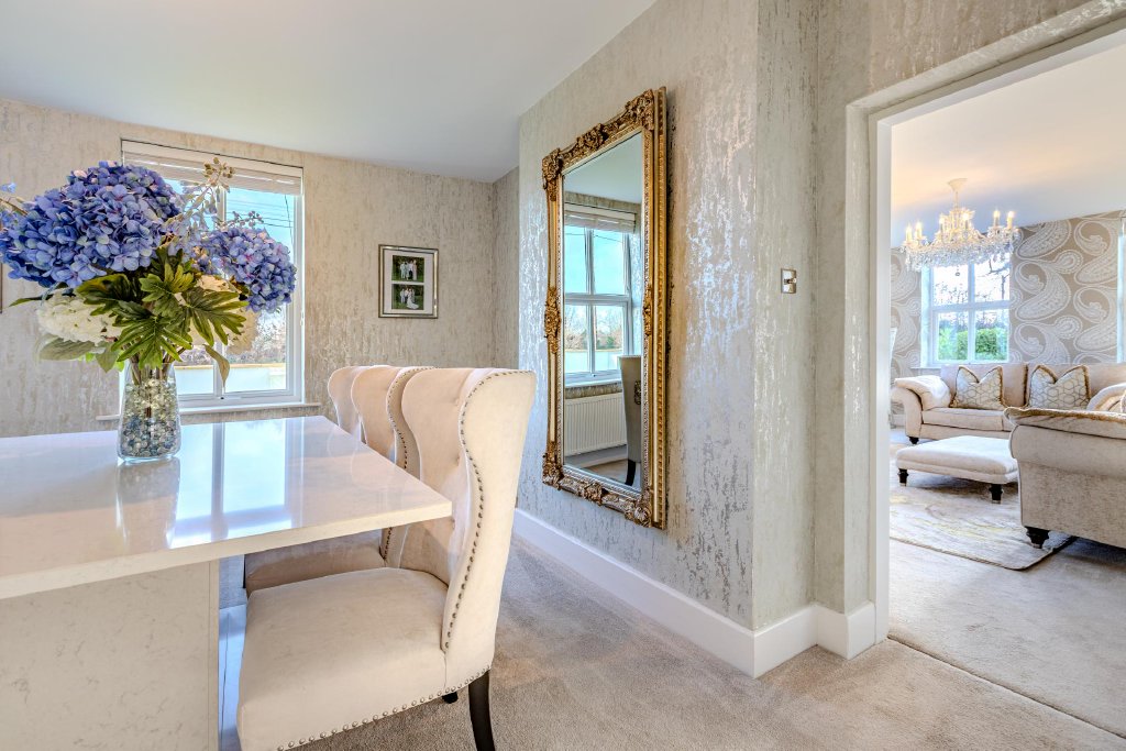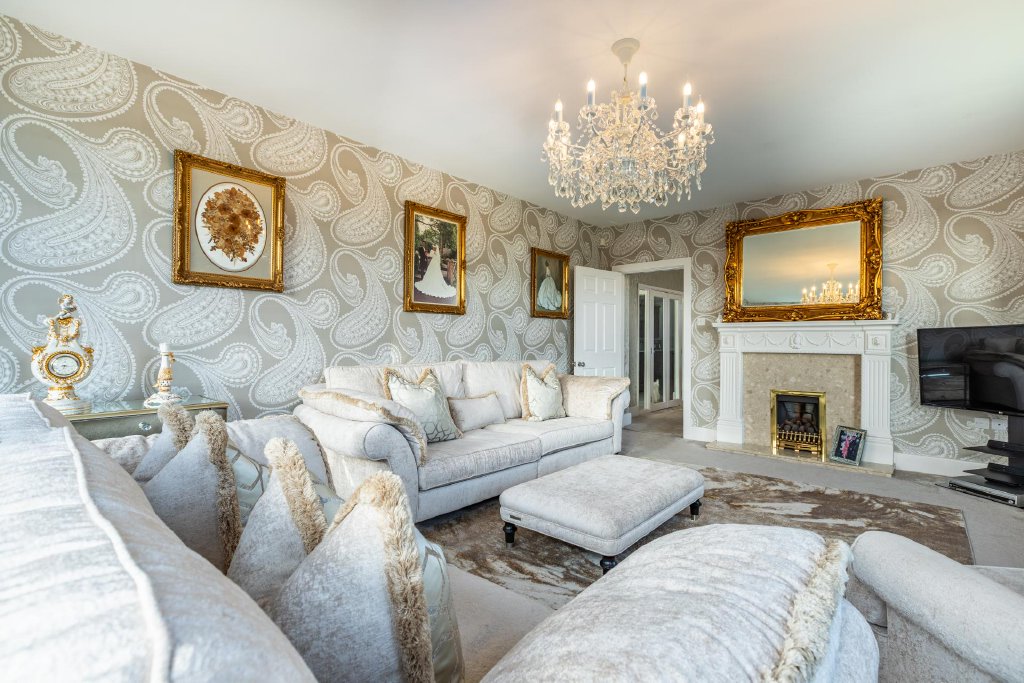 Flowing gracefully from this central hub is a beautifully styled formal dining room and a generously proportioned living room, creating elegant yet comfortable reception areas. The living room enjoys tranquil garden views and centres around a gas fire with feature surround, providing a warm and inviting focal point. Completing the ground floor is a versatile snug, currently utilised as a home office/playroom, offering flexibility to suit a variety of lifestyles.