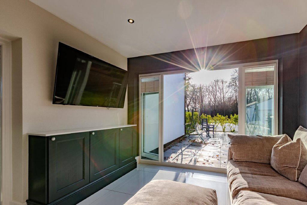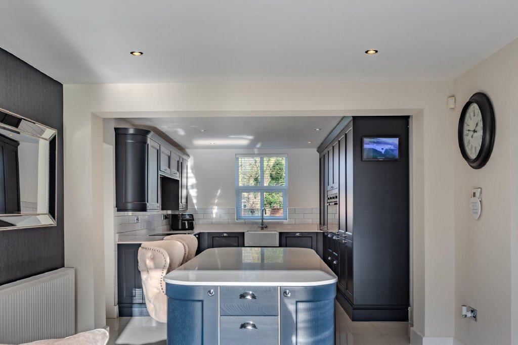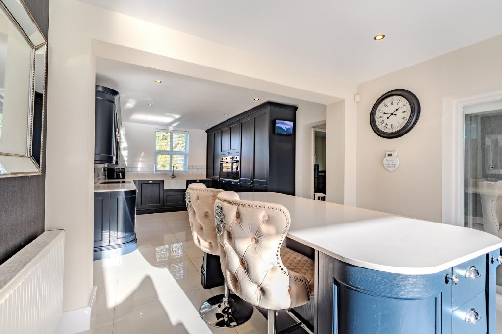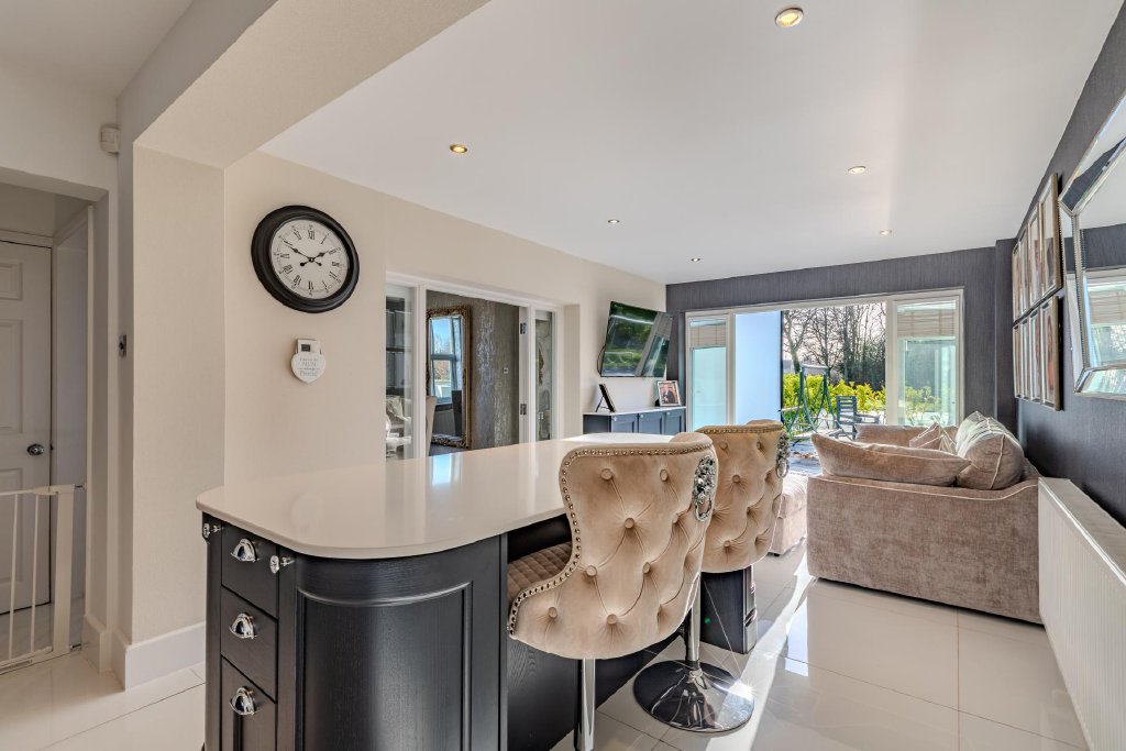 The welcoming hallway leads to the true heart of the home: an impressive open-plan kitchen, living and dining space, thoughtfully designed for modern family living and effortless entertaining. The bespoke kitchen features an array of beautifully crafted base and wall units, complemented by integrated appliances and a central island offering additional workspace and informal seating. Bathed in natural light from patio doors that open directly onto a private paved terrace, the space invites seamless indoor-outdoor living and al fresco dining during the warmer months.