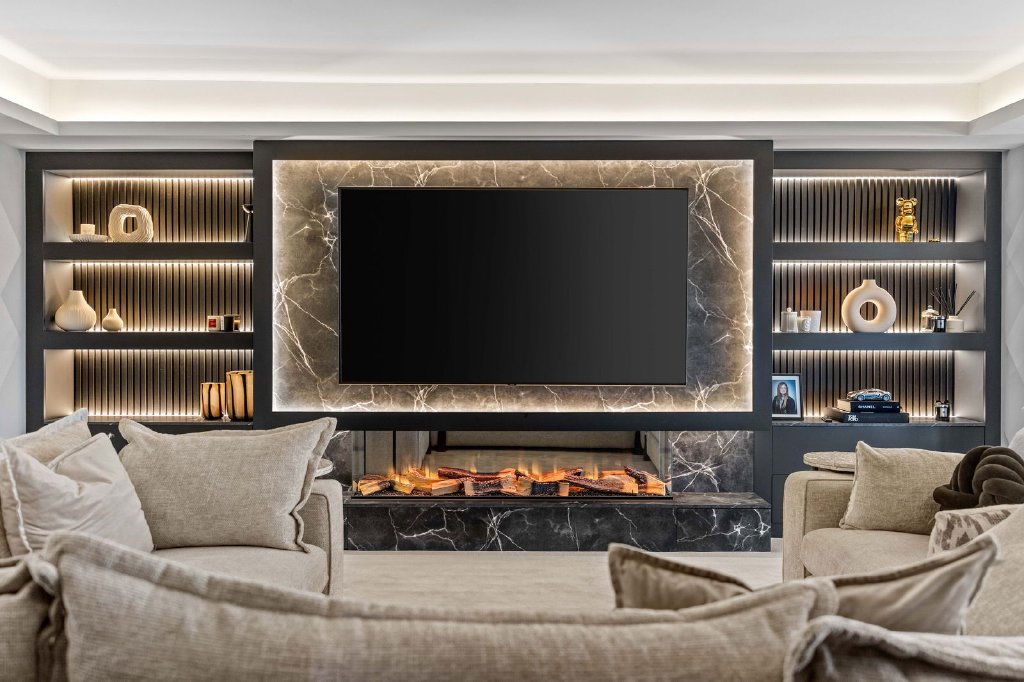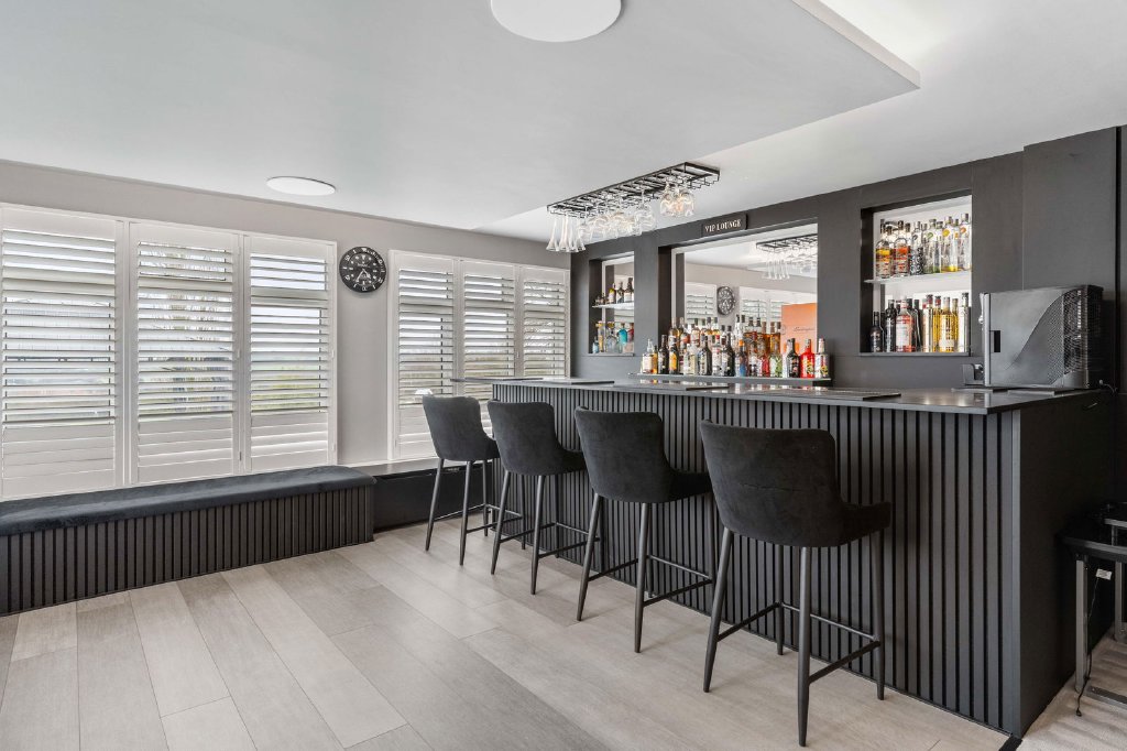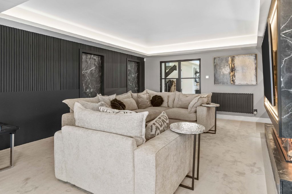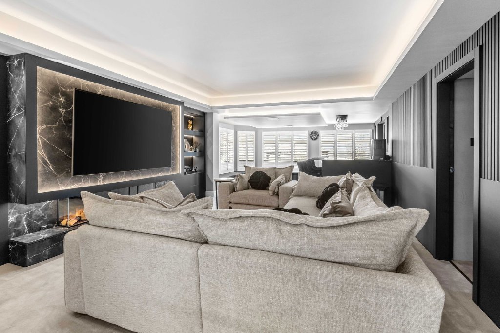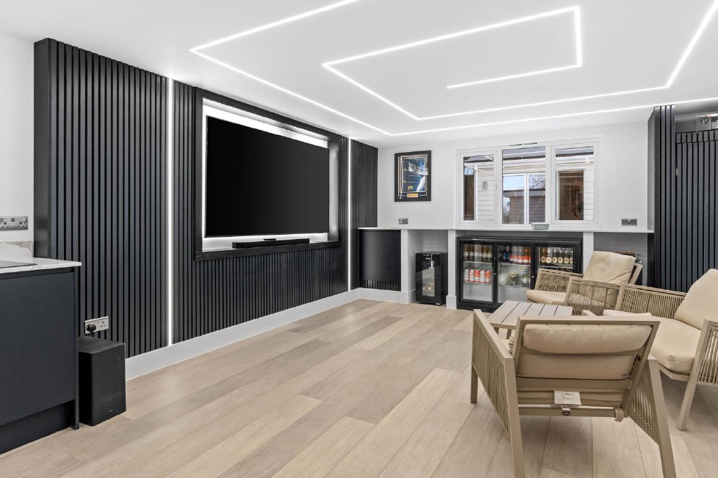 You are welcomed into this exceptional residence via a grand entrance hall that leads directly into a bespoke living and entertaining space — an impressive focal point of the home, complete with a luxury home bar, making it ideal for both formal entertaining and relaxed social gatherings. This space flows seamlessly through double doors into the spectacular private cinema room, fully equipped with a surround sound system and bespoke tiered seating for up to fourteen guests, delivering a truly immersive, cinematic experience within the comfort of your own home.