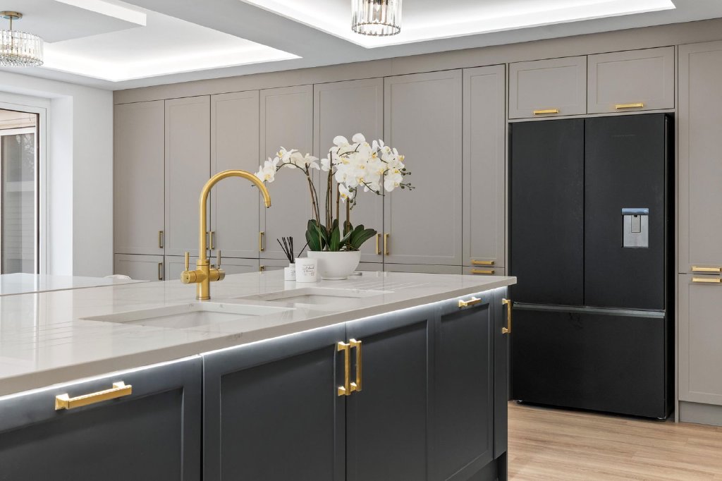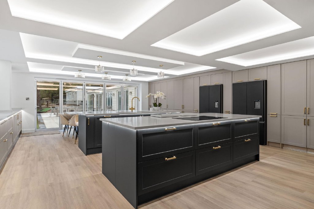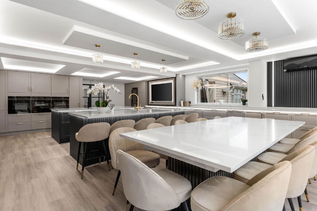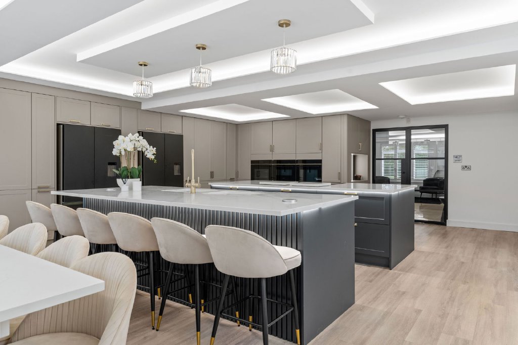 At the heart of the property lies the stylish bespoke kitchen, thoughtfully designed for both everyday family living and large-scale entertaining. It is fitted with Siemens touch-screen digital ovens, a Siemens dishwasher, Fisher & Paykel refrigeration, and finished with sleek quartz worktops. Discreet hidden doors lead through to a newly completed, high-end utility room, superbly appointed with two washing machines and two dryers, providing practical functionality without compromising on aesthetics. The kitchen further benefits from bi-folding doors opening directly onto the outdoor entertaining terrace, creating a seamless indoor-outdoor lifestyle.