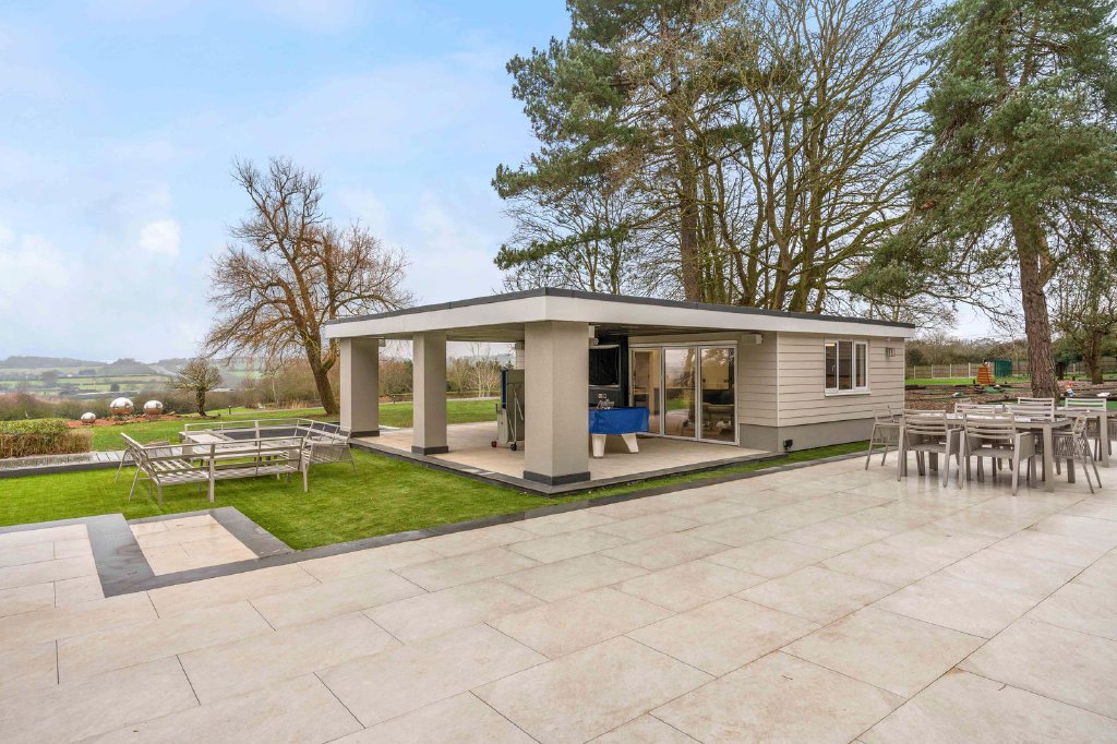 The detached summer entertainment building offers an exceptional social space, fully equipped with beer pumps, a surround sound system, and DMX lighting, providing the perfect environment for hosting memorable events, celebrations, and summer evenings with family and friends.