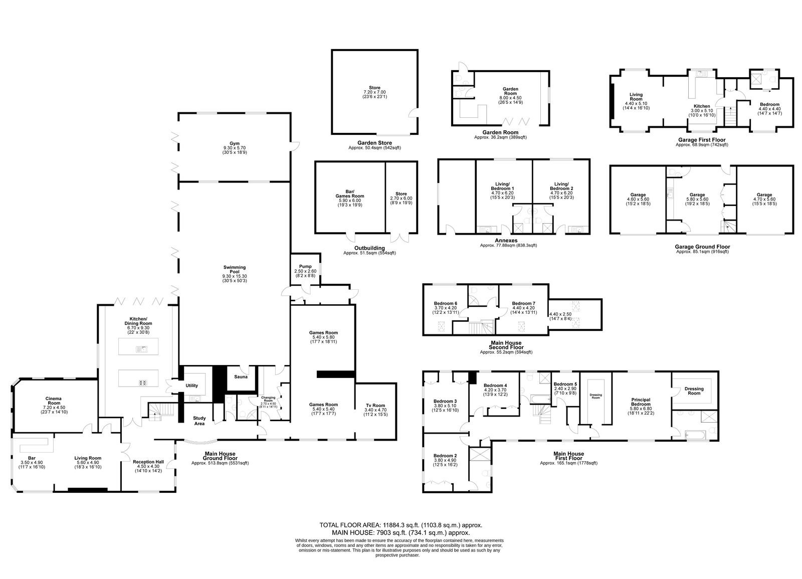 This exceptional residence offers over 11,884 sq. ft., of accommodation including a magnificent 7-bedroom main house featuring an indoor swimming pool, large private gym, home cinema and extensive entertaining and leisure spaces throughout. The property also includes two self-contained one-bedroom annexes, a detached entertainment building and a substantial triple garage block with auxiliary accommodation above, creating a highly versatile multi-generational or income-generating estate.