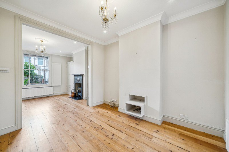 Step inside, you are greeted by a wonderful sense of light and volume which immediately sets the tone. The two reception rooms are beautifully proportioned and framed by large windows that invite natural light throughout the day. A handsome fireplace forms a striking focal point in the principal reception room, adding warmth and refinement, while the generous dimensions of both rooms comfortably accommodate sophisticated entertaining as well as relaxed everyday living.