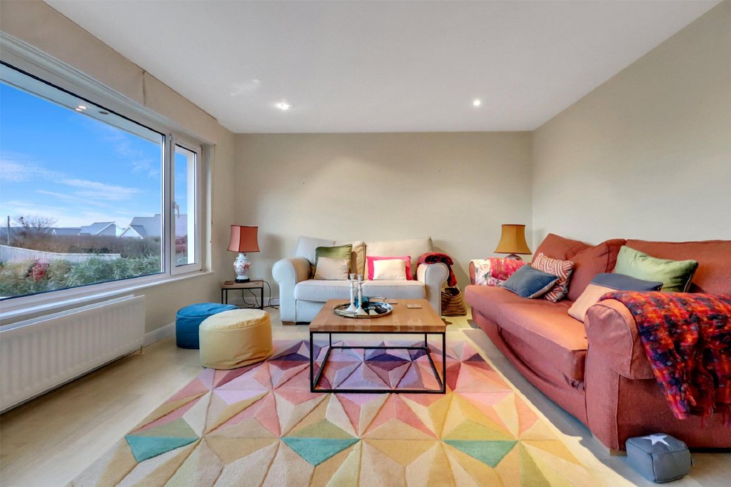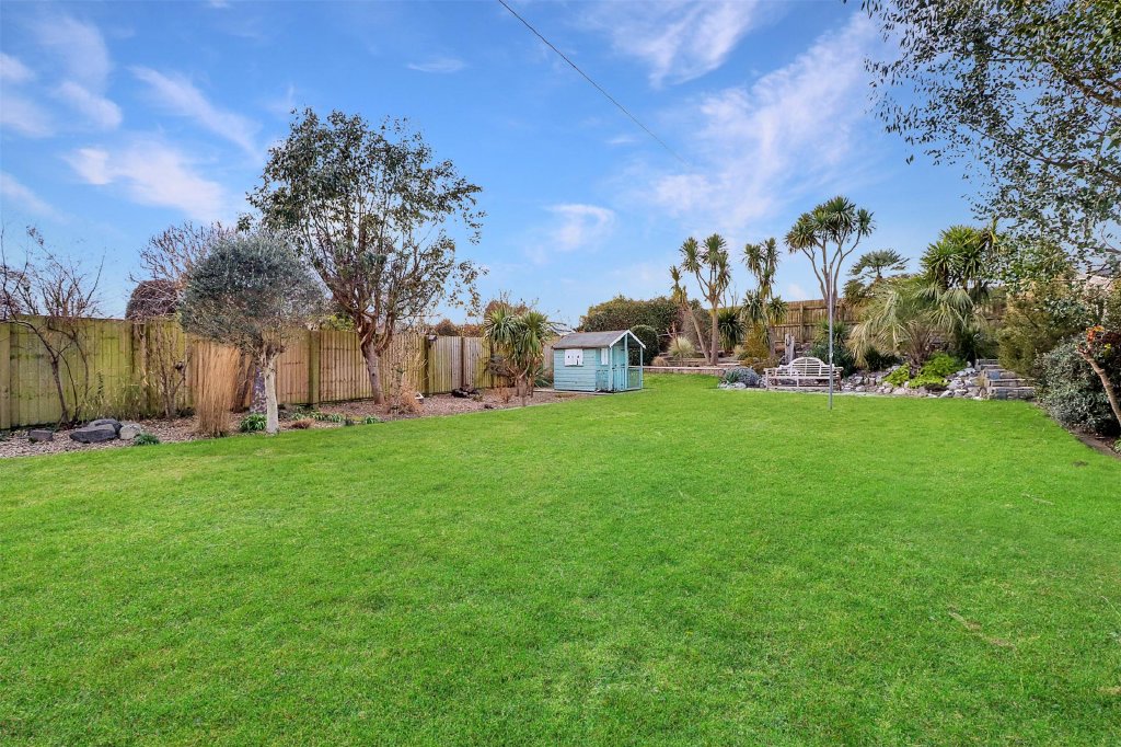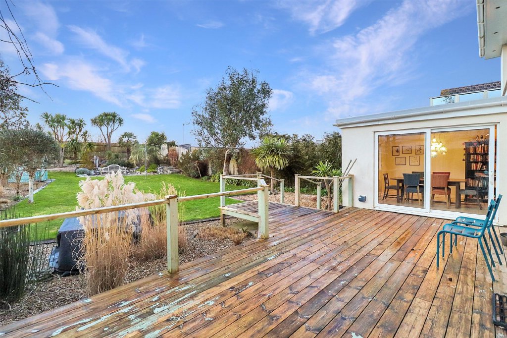 Externally, the rear garden is both generous and level, thoughtfully landscaped to maximise enjoyment. A substantial area of wooden decking adjoins the rear of the property, providing the perfect setting for al fresco dining, summer gatherings or simply relaxing in the coastal air, while the remainder of the garden offers ample room for children, pets or further planting whilst being bordered by mature trees shrubs and bushes. To the rear of the garden a useful gateway which offers access onto the roadside allowing for a short direct walk to the beachside.