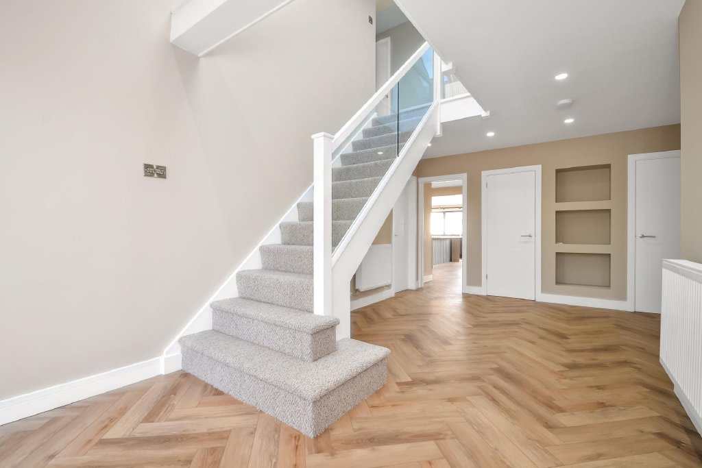OPEN PLAN HALLWAY 19' 7" x 9' 8" increasing to maximum 12'10"(5.97m x 2.95m) Feature vaulted ceiling with large skylight window and Juliette balcony over, ceiling spotlights, zoned lighting, balustrade staircase with glazed panels rising to first floor, wood flooring, two radiators, doors to primary rooms, feature display shelving with built-in cupboards to either side, one housing Gledhill hot water cylinder, smoke alarm.
