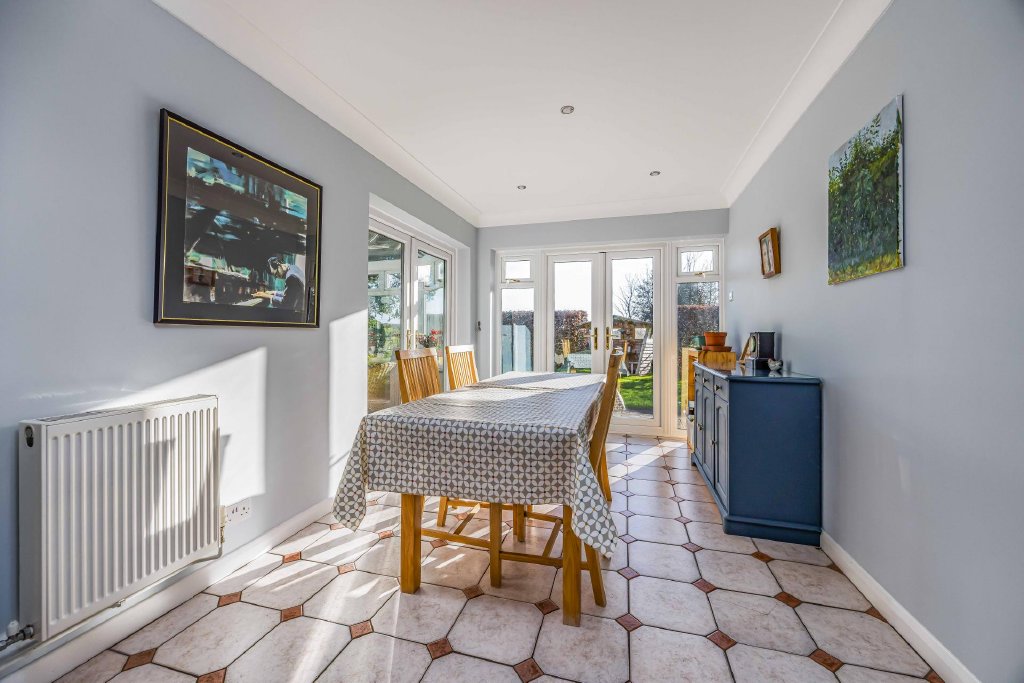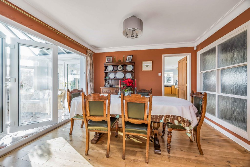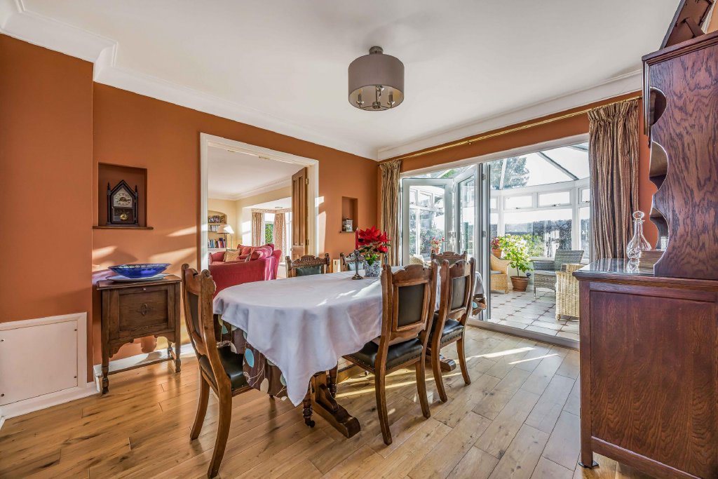 DINING ROOM 11' 8" x 10' 5" (3.56m x 3.18m) Glazed panelling to one wall, light oak flooring, radiator, dimmer switch, double doors leading to sitting room, door to kitchen, tri-folding double glazed doors leading to conservatory.