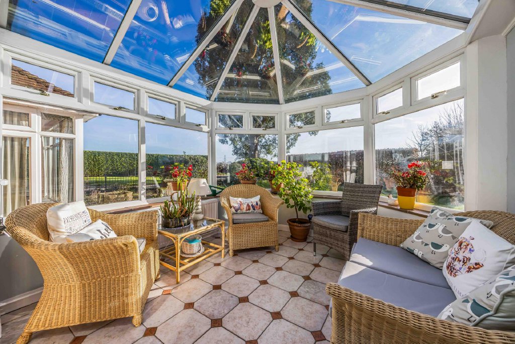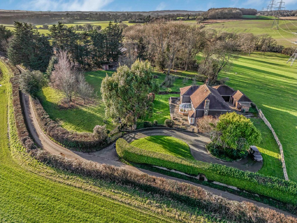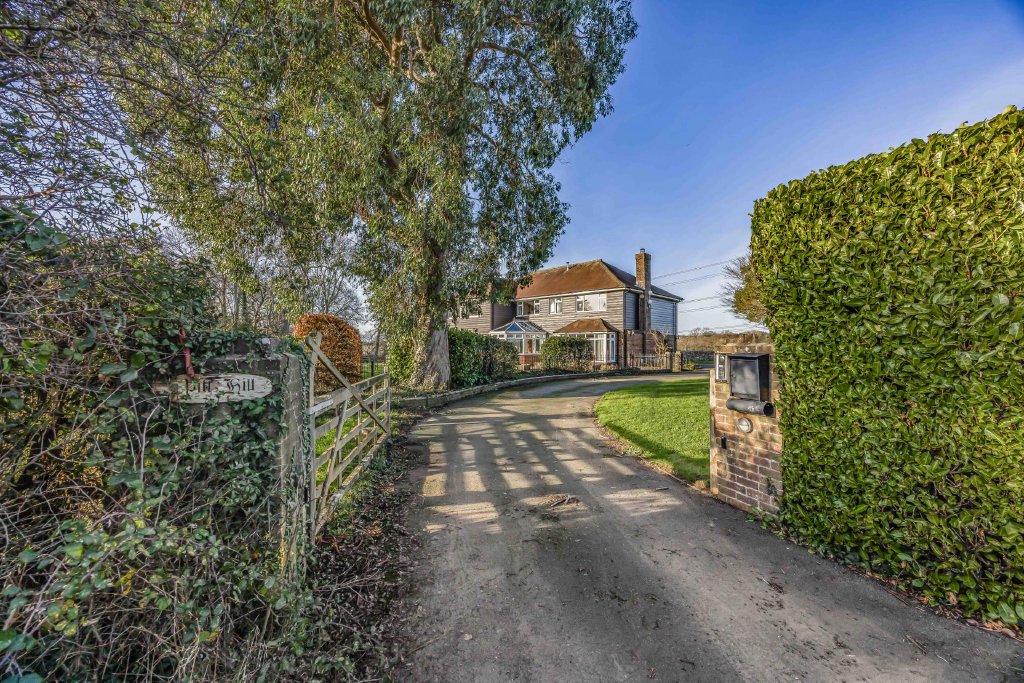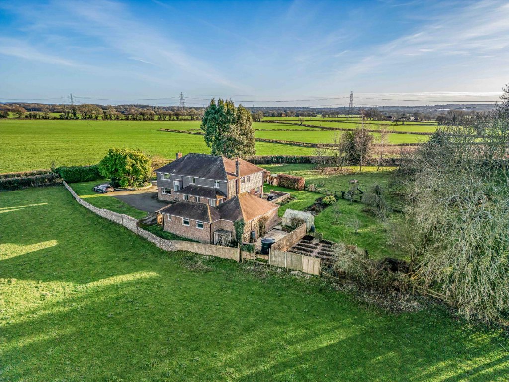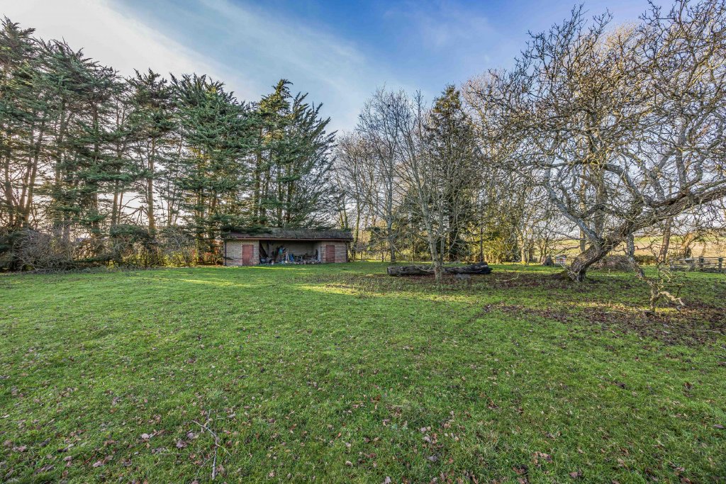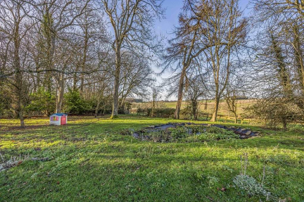 OUTSIDE The whole garden extends to 1.62 acres. To the side of the house is a lowered crazy paved patio with steps up to raised terrace leading to front of house and lawned garden, behind the garage is a further storage area with oil tank and outside cold water butt, lighting and power, greenhouse, paddock with fruit trees, vegetable patch, the garden is fenced off from the paddock with stable style fencing and small pond, to the edge of the garden on the boundary is a:
