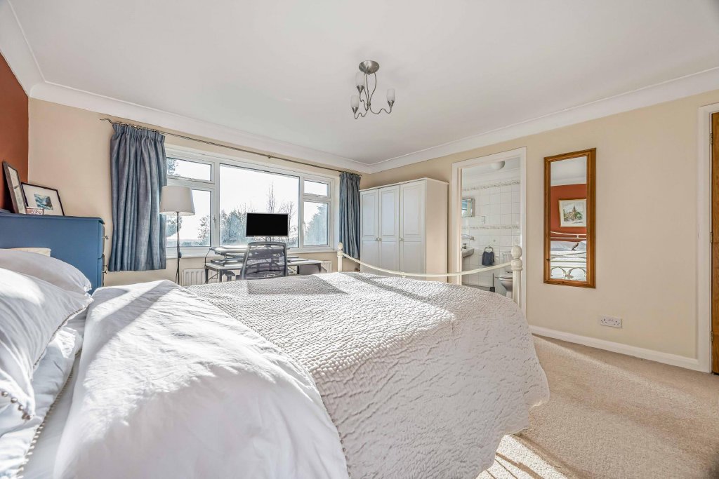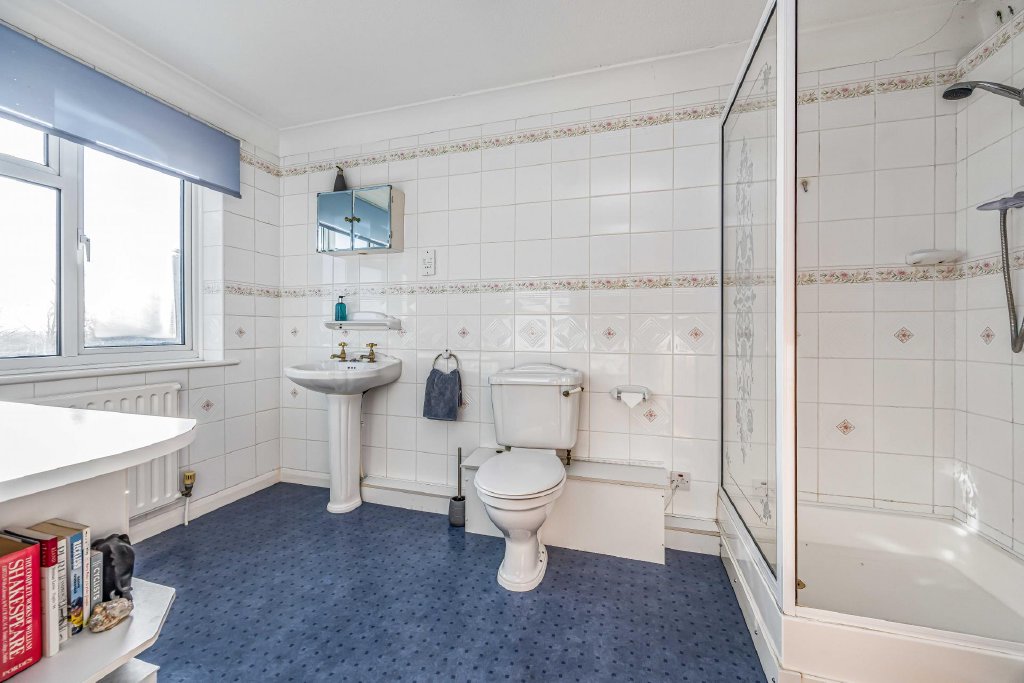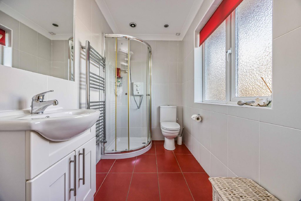 EN-SUITE SHOWER ROOM Double glazed window to side aspect overlooking garden, chrome heated towel rail, concealed cistern w.c., rectangular wash hand basin with mixer tap and cupboards under, large shower cubicle with drench style hood and separate shower attachment, matching flooring.