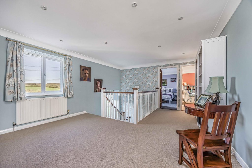 FIRST FLOOR Split-level landing with stairs leading to primary landing, large double glazed window to rear aspect with outstanding views over woodland and farmland beyond.