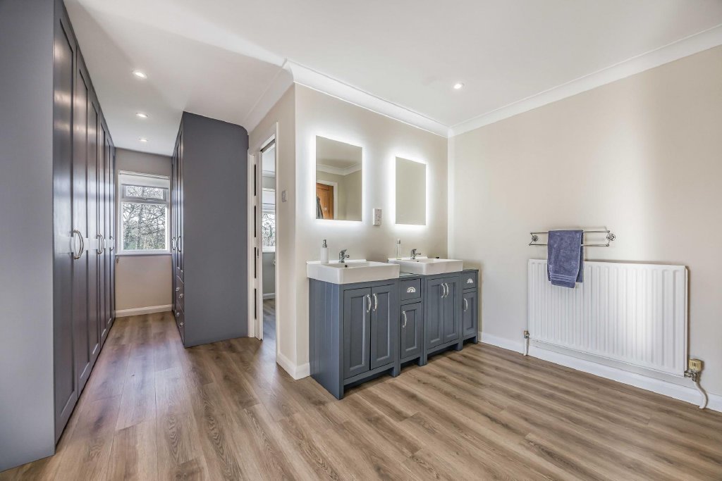 DRESSING ROOM 17' 10" decreasing to 7'5" x 12' 0" (5.44m x 3.66m) L shaped, waterproof laminate flooring, radiator, twin rectangular wash hand basins with cupboards, shelving and drawers under, mirror with automated lighting over, access to loft space, arched opening leading to bedroom, comprehensive range of floor to ceiling built-in wardrobes to two walls with hanging space, shelving and drawers under, window to side aspect overlooking garden and paddock, ceiling coving and spotlights, door to: