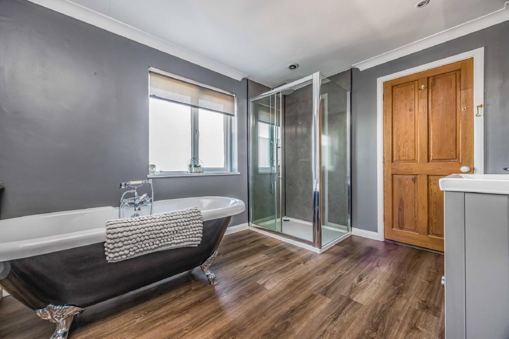 FEATURE FAMILY BATHROOM 11' 7" x 8' 11" (3.53m x 2.72m) Claw footed free standing double ended bath with telephone style mixer tap and shower attachment, corner shower cubicle with drench style hood, separate shower attachment and sliding panelled door, double glazed window to rear aspect, low level w.c., chrome heated towel rail, wash hand basin with cupboards under, shaver point with light over, roll top radiator.