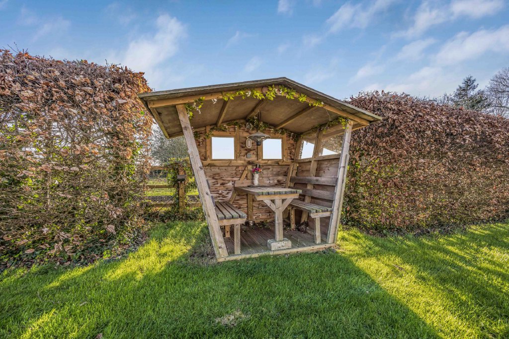 FIELD Fifteen solar panels, the field is enclosed by hedges and fencing on all sides with separate fenced off solar panelled area and farm gate, small pond with power, heating and seating pod closed on three aspects with windows open to the fourth with central bench and matching seats.