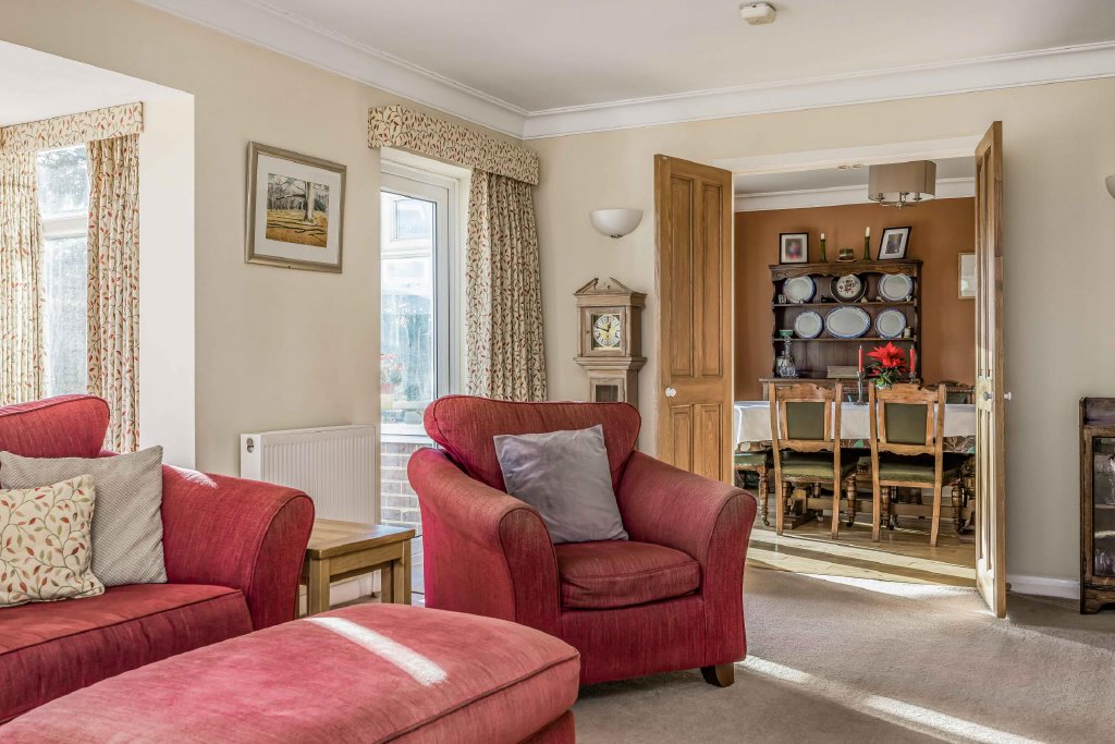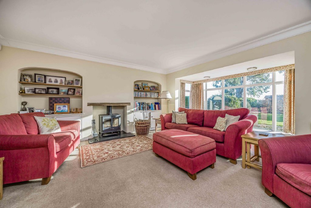 SITTING ROOM 20' 7" x 19' 3" into bay window (6.27m x 5.87m) Double glazed square bay window to front aspect overlooking driveway and garden with low sill and seating under, two radiators, double glazed door to front aspect, central chimney breast with log burner and built-in cupboards and shelving to either side, wall lights, ceiling coving, double doors leading to: