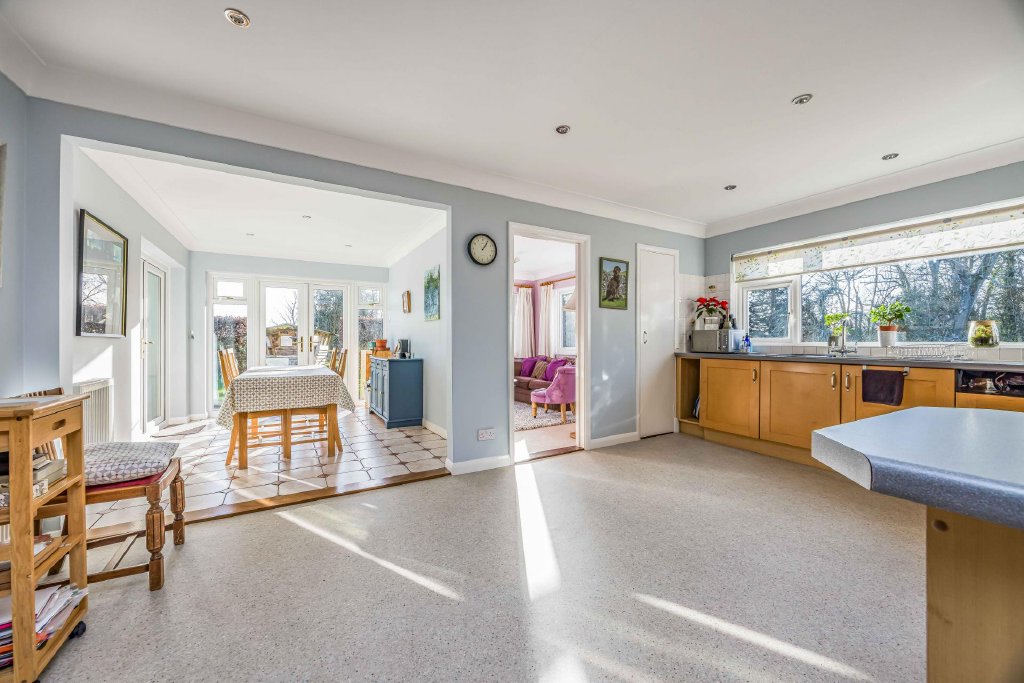 Further range of matching wall and floor units with roll top work surface, inset double bowl stainless steel sink unit with mixer tap, double glazed window to side aspect overlooking garden and paddock, Bosch integrated dishwasher with matching door, range of drawer units, space for free-standing rangemaster electric oven, pelmet lighting, dresser style unit with glazed panelled doors to upper section and drawers under, peninsular unit with storage under and drawers to one side, matching flooring, ceiling spotlights and coving, large built-in larder with range of shelving, door to living room, radiator.