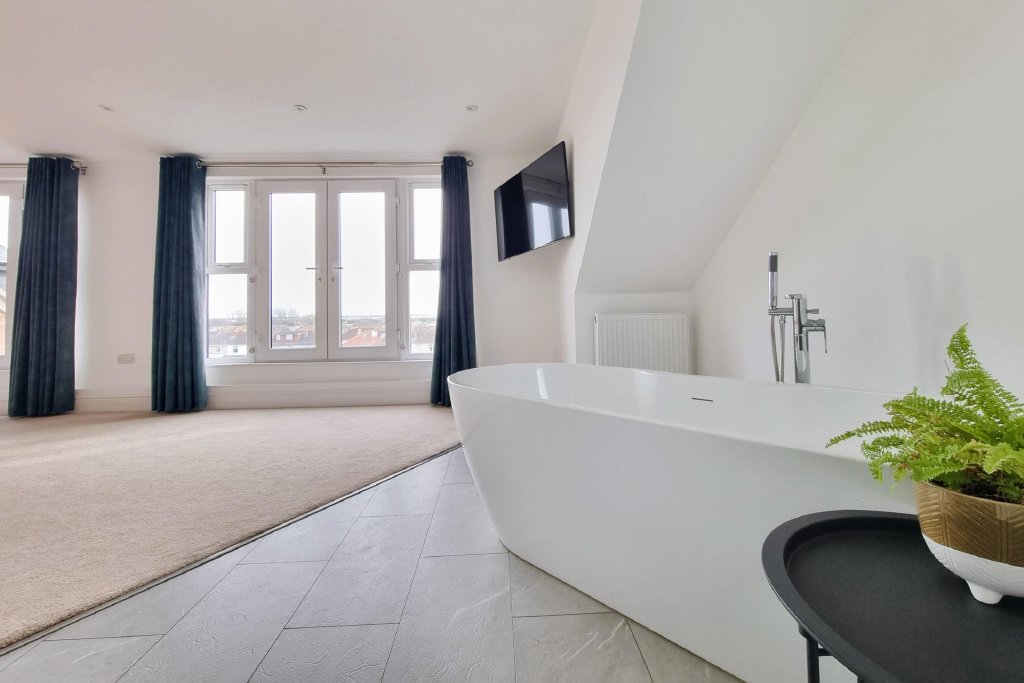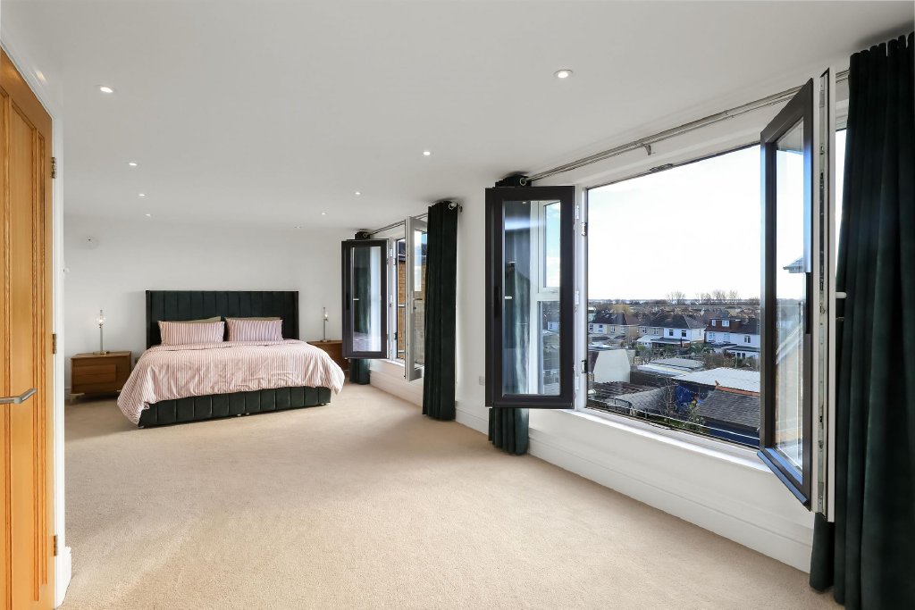 OPEN PLAN BEDROOM (1) SUITE 28' 2" x 12' 5" maximum (8.59m x 3.78m) Door from landing leading to open plan bedroom suite to one side and bathroom to the other, four double glazed windows with Juliet balconies and glazed screens to rear overlooking garden with far reaching views over roof tops towards Langstone Harbour, Hayling Island and the City of Portsmouth in the distance, ceiling spotlights, radiator, door to dressing room.