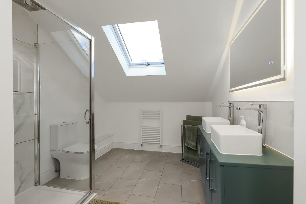 OPEN PLAN BATHROOM Open plan layout with double ended panelled bath with separate mixer tap and shower attachment, bracket and wiring for wall mounted T.V., ceiling spotlights, radiator, luxury vinyl tiled flooring, opening directly into shower area with shower cubicle with drench style hood and separate shower attachment, heated towel rail, skylight window, twin sink units with mixer taps and cupboards under, tiled splashback, mirror with automated lighting over, low level w.c.