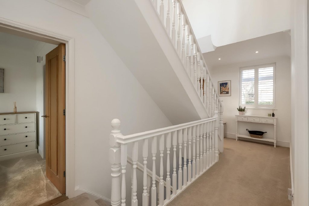 FIRST FLOOR Landing with balustrade, double glazed window to front aspect with plantation shutter blinds, balustrade staircase rising to top floor, panelled doors to primary rooms.