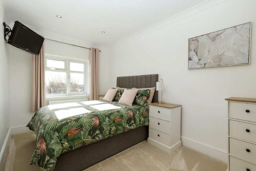 BEDROOM 2 13' 9" x 8' 1" (4.19m x 2.46m) Double glazed window to rear aspect with views over gardens towards Langstone Harbour and Hayling Island in the distance, radiator, bracket and wiring for wall mounted T.V., smoke alarm, ceiling spotlights and coving, door to: