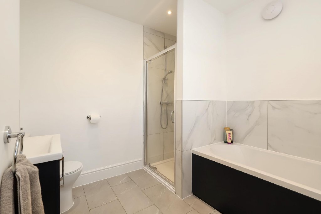 EN-SUITE SHOWER ROOM White suite comprising: close coupled w.c., wash hand basin with cupboards under, tiled splashback, shower cubicle with sliding panelled door, drench style hood and separate shower attachment, extractor fan, ceiling spotlights, luxury vinyl tiled flooring.