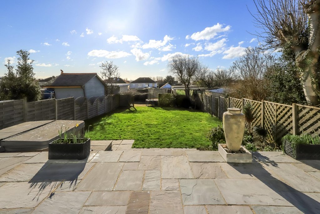 OUTSIDE Directly to the rear of the property accessible from the family room is a full width paved raised terrace with hot tub, lighting, cold water tap and power points, central steps leading down to the primary southerly facing lawned rear garden with fence panelling on either side, to the far end of the garden is a double gated pedestrian and vehicular access leading to large hardstanding access from rear service road.