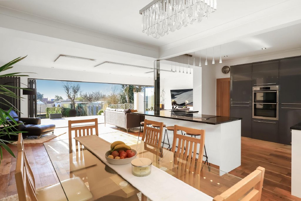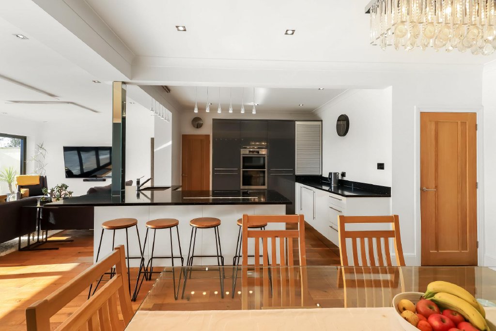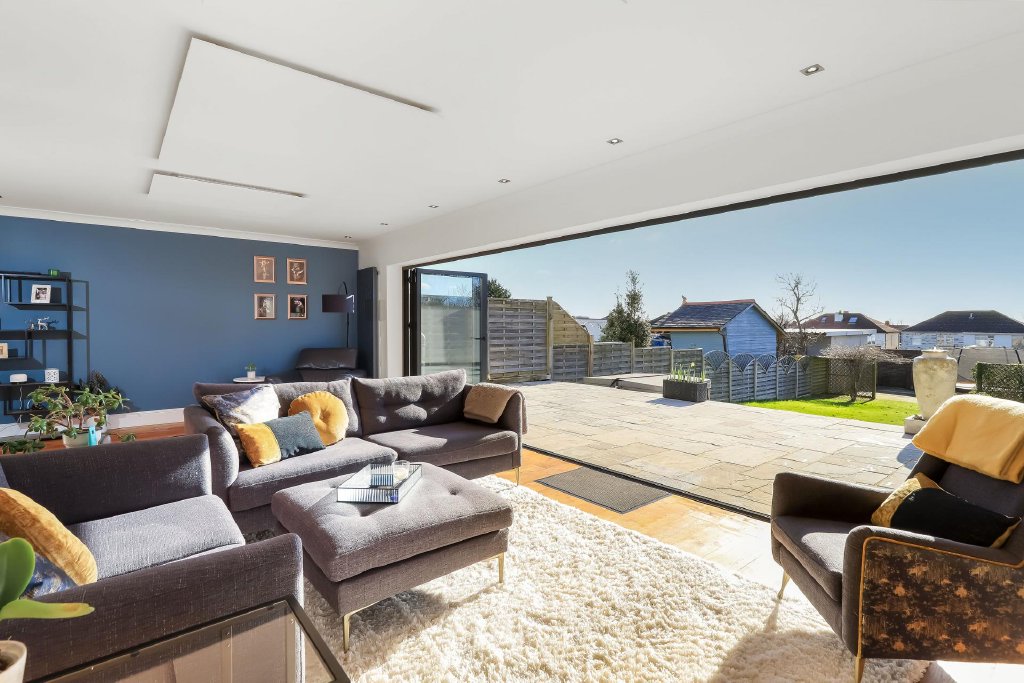 FAMILY ROOM 26' 7" x 14' 0" (8.1m x 4.27m) Full width bi-folding doors to the rear opening onto patio and southerly facing rear garden, panelled ceiling lighting and spotlights, tall contemporary style radiator, matching flooring, hidden opening with panel leading to: