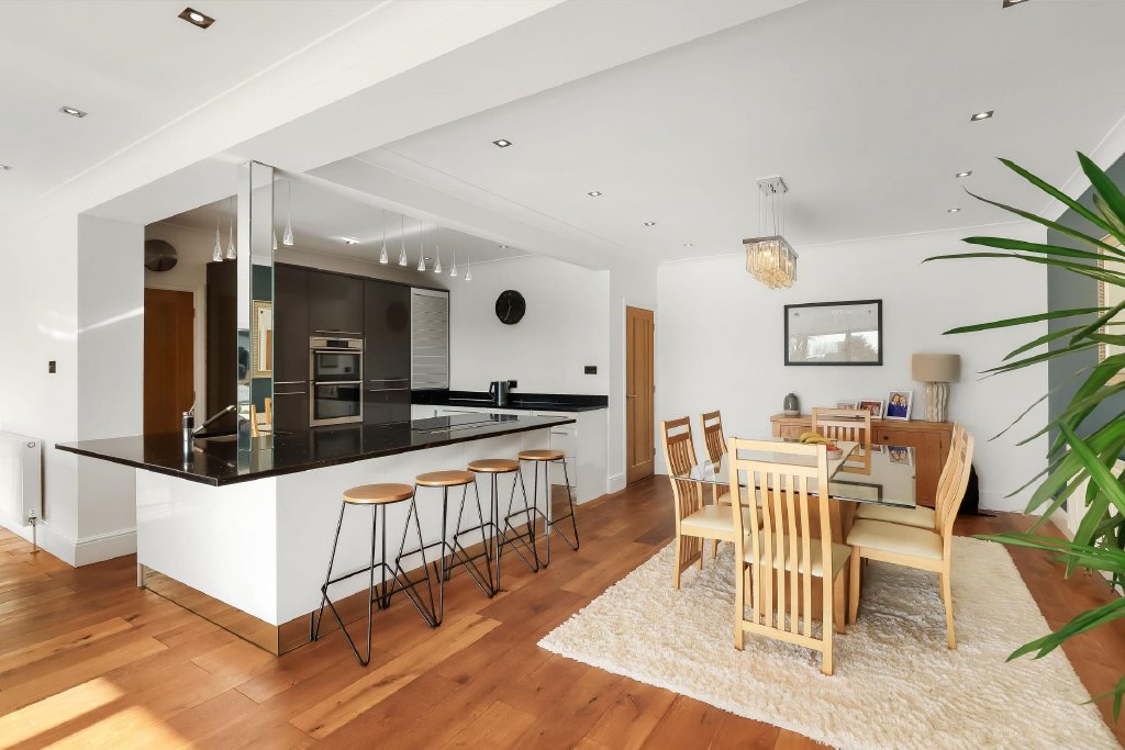 DINING AREA Ceiling coving and spotlights, radiator, wooden flooring, L shaped breakfast bar divide leading to:
