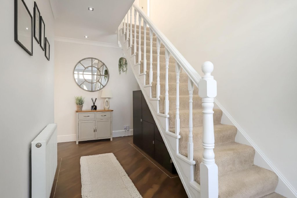 HALLWAY Kardean flooring with coir matted area, ceiling coving, wired-in smoke alarm, ceiling spotlights, balustrade staircase rising to first floor with understairs cupboard, doors to primary rooms, radiator.