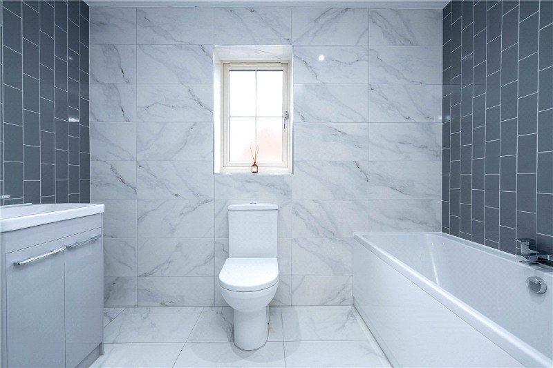 The real heart of the home is the impressive open-plan kitchen, dining and family area to the rear. The kitchen has been stylishly fitted with shaker-style units, quartz worktops, a Belfast sink and integrated appliances, along with a central island. The herringbone flooring and recessed lighting add to the high-quality finish. This space flows effortlessly into the dining area, with French doors opening onto the rear patio, ideal for entertaining. A separate utility room and WC complete the ground floor.